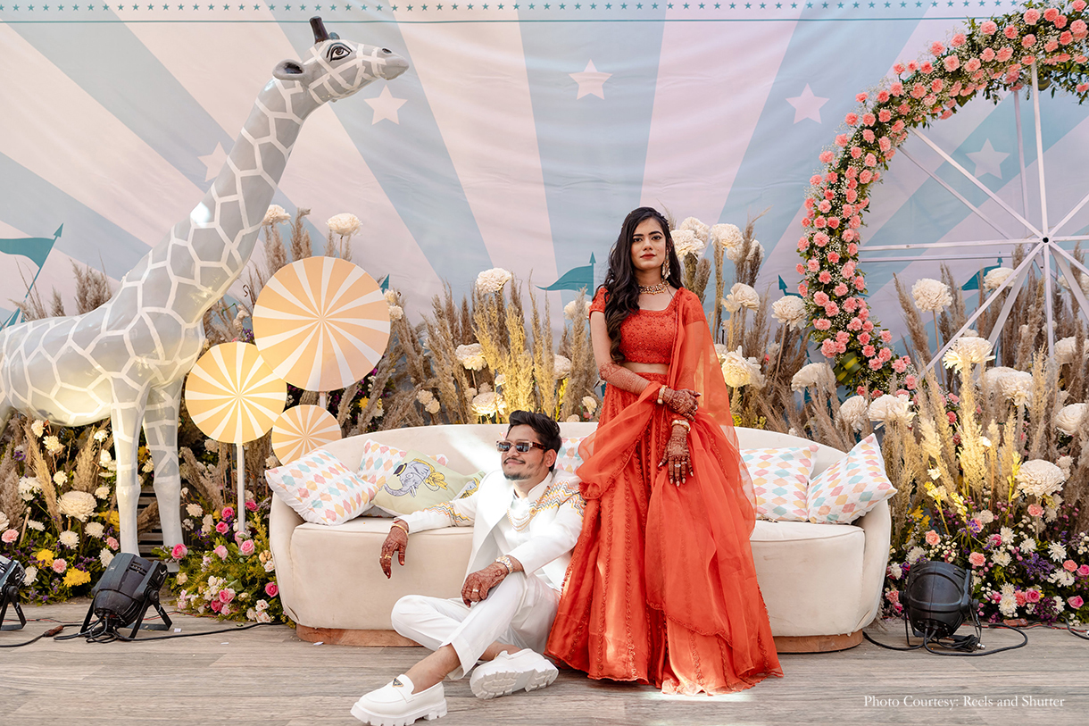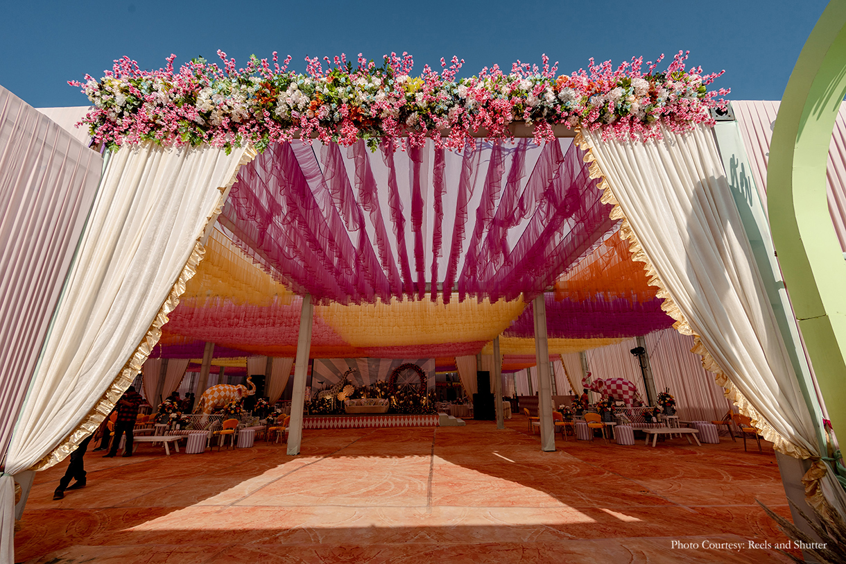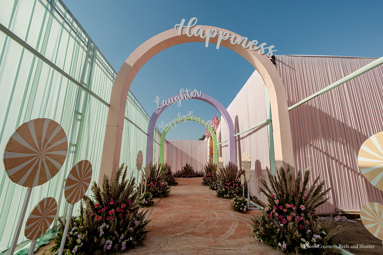 Mishal shares, “The design story revolved around the ‘game of pastels’ theme with the venue being a barren plot of land. The entry décor of the carnival had 4 semi-circle arches painted in pastel hues. We used colours like Buff Orange, Yellow Iris, Cherry Blossom, and Mauve Mist for our ceiling treatment and semi-circle arches. This colour palette made the entire venue look particularly fresh. The stage was crafted to exude carnival vibes with a Ferris wheel and a Giraffe statue which is regarded as a symbol of love. We created contemporary lounge seating options in front of the stage and there were various game stalls for entertainment along with an illusionist.