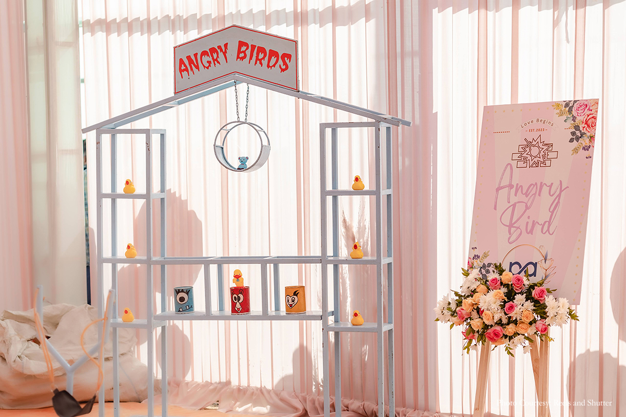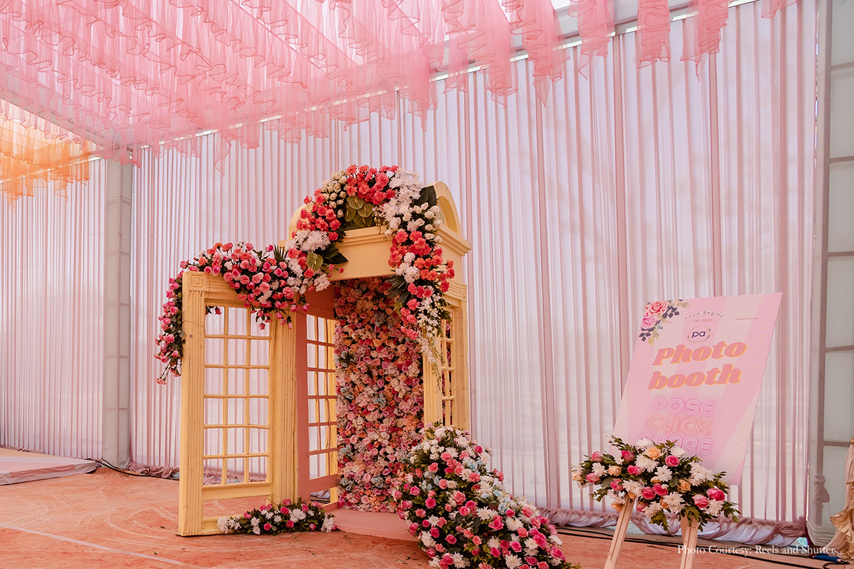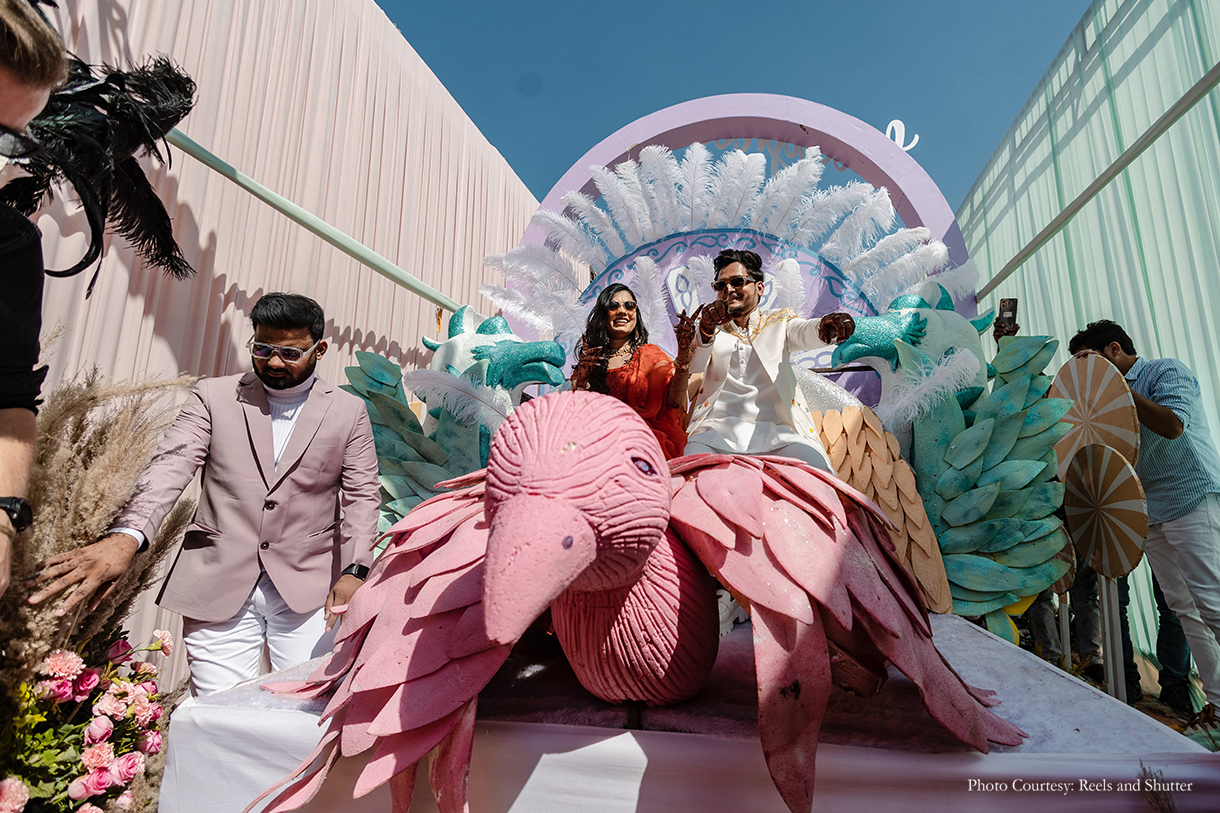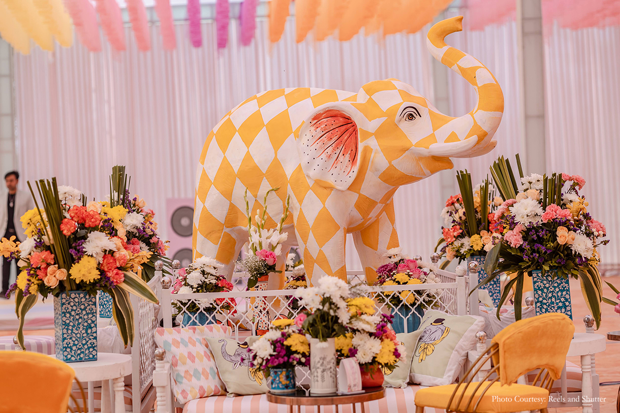 Mishal shares, “The design story revolved around the ‘game of pastels’ theme with the venue being a barren plot of land. The entry décor of the carnival had 4 semi-circle arches painted in pastel hues. We used colours like Buff Orange, Yellow Iris, Cherry Blossom, and Mauve Mist for our ceiling treatment and semi-circle arches. This colour palette made the entire venue look particularly fresh. The stage was crafted to exude carnival vibes with a Ferris wheel and a Giraffe statue which is regarded as a symbol of love. We created contemporary lounge seating options in front of the stage and there were various game stalls for entertainment along with an illusionist.