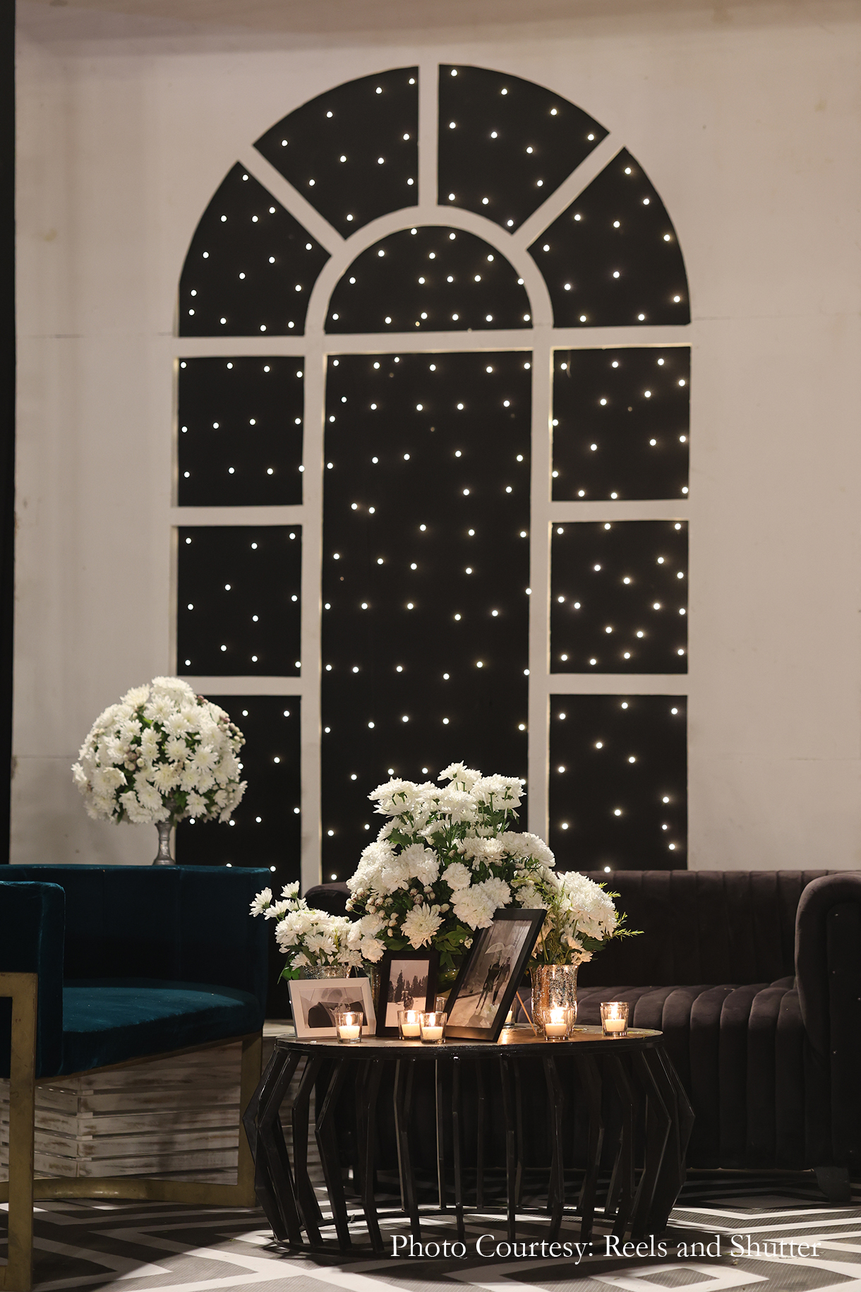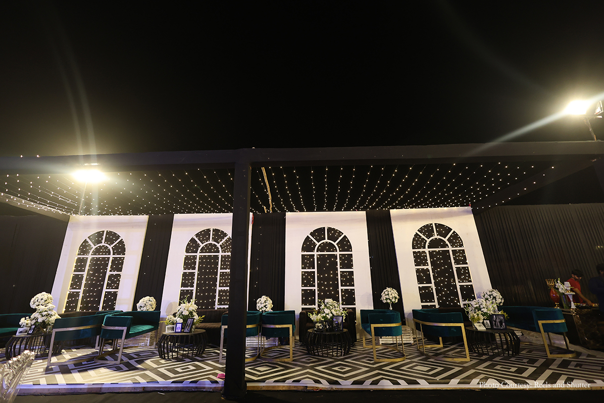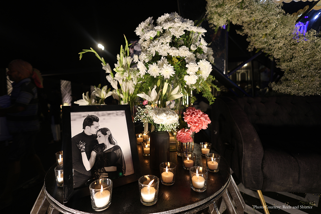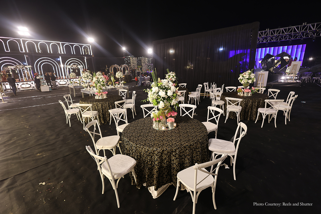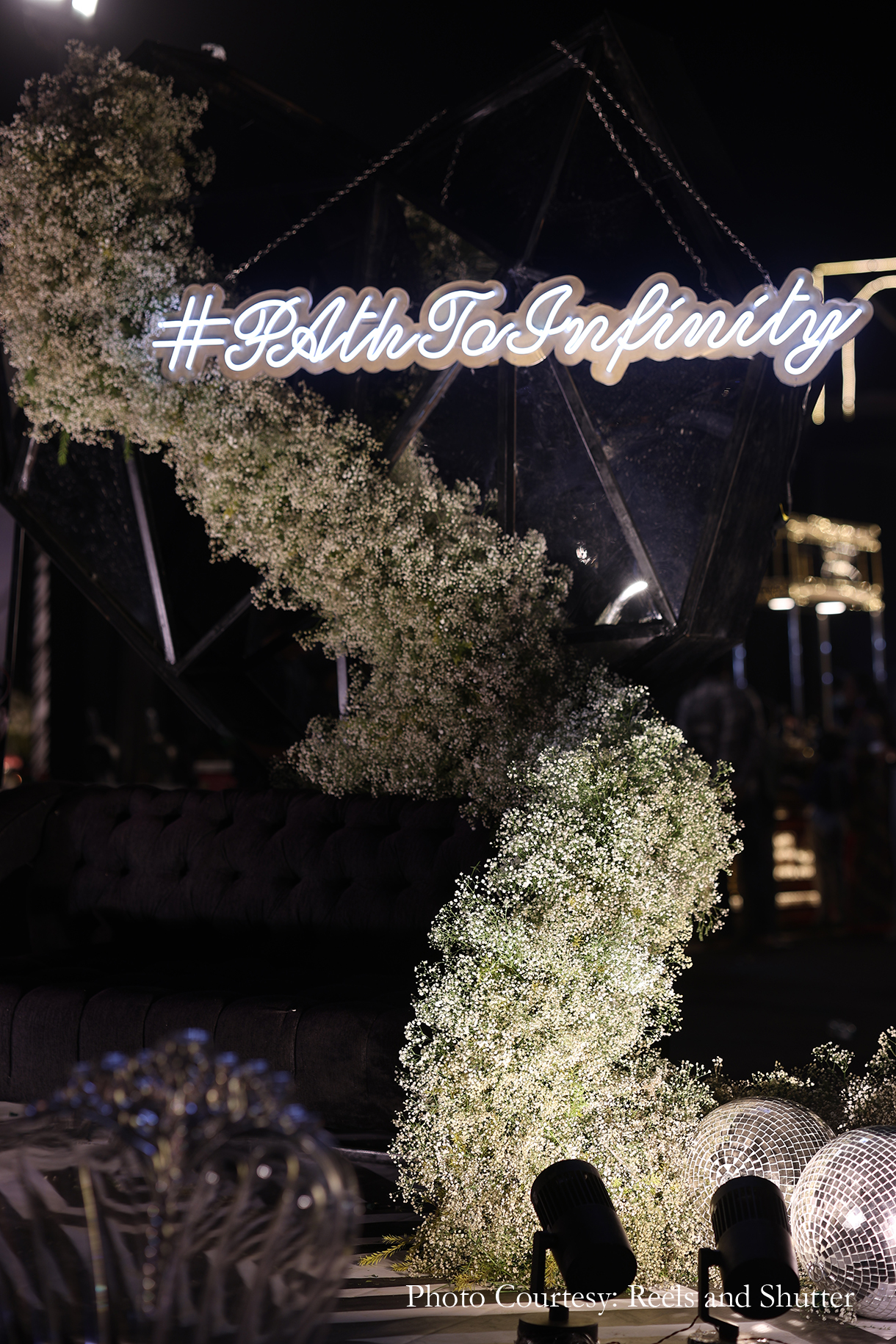 Mishal shares, “The sangeet again was on an open plot of land where we constructed a 120*100 ft trussing and gave the guests a clear view of the sky. The entrance was designed as a tunnel of 40 feet and for the side walls we used crushed papers and silver glitter for a glamorous look. The floor of the entry tunnel was acrylic with tube light lighting up the pathway and a chrome ceiling. The sidewalls included the couple’s portraits which were alternated by mirrors.” He goes on to add, “We also produced a diamond-shaped heart, installed chrome sheets and added baby’s breath blooms for the couple’s backdrop. The side tables consisted of neon signage with the couple’s hashtag.”