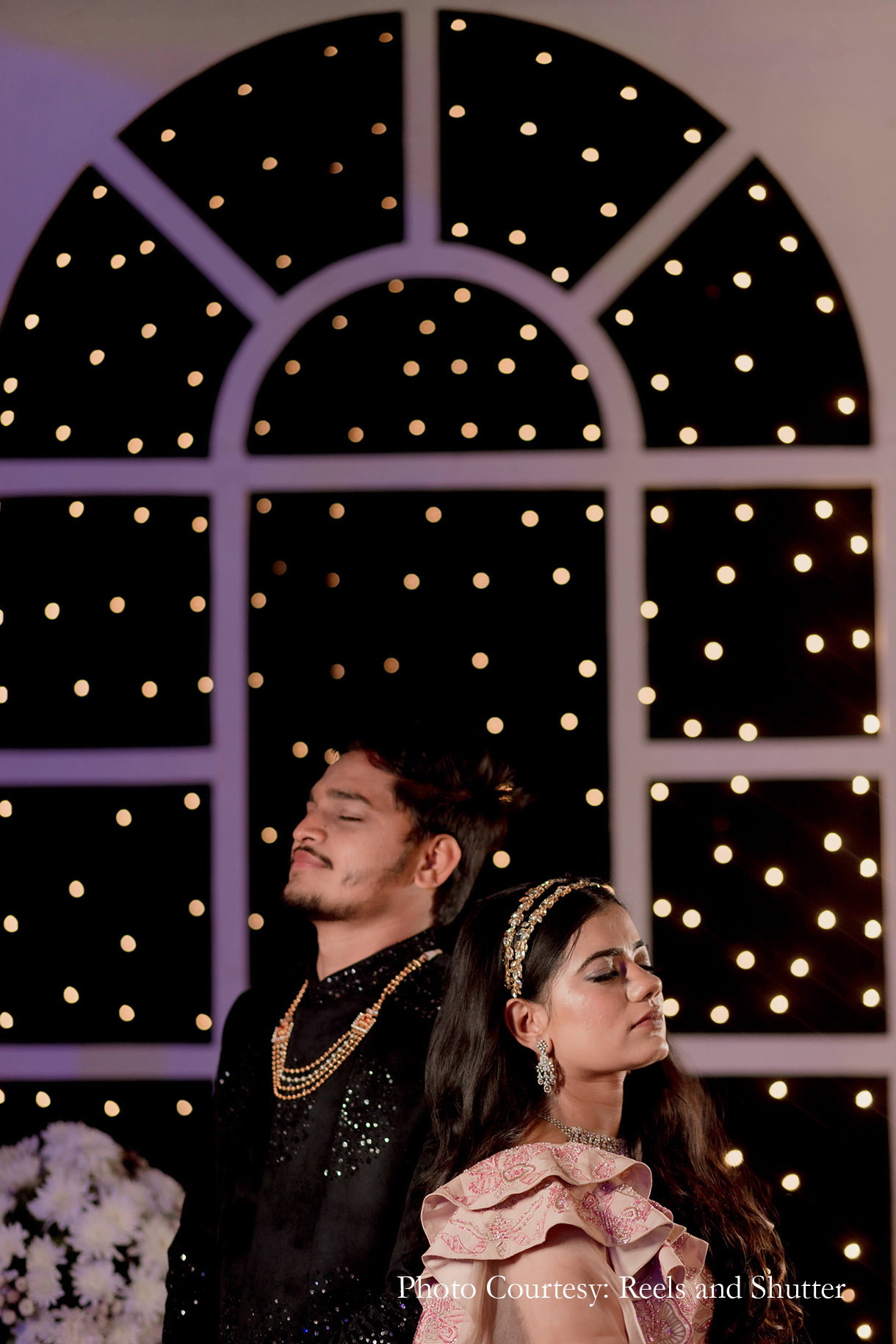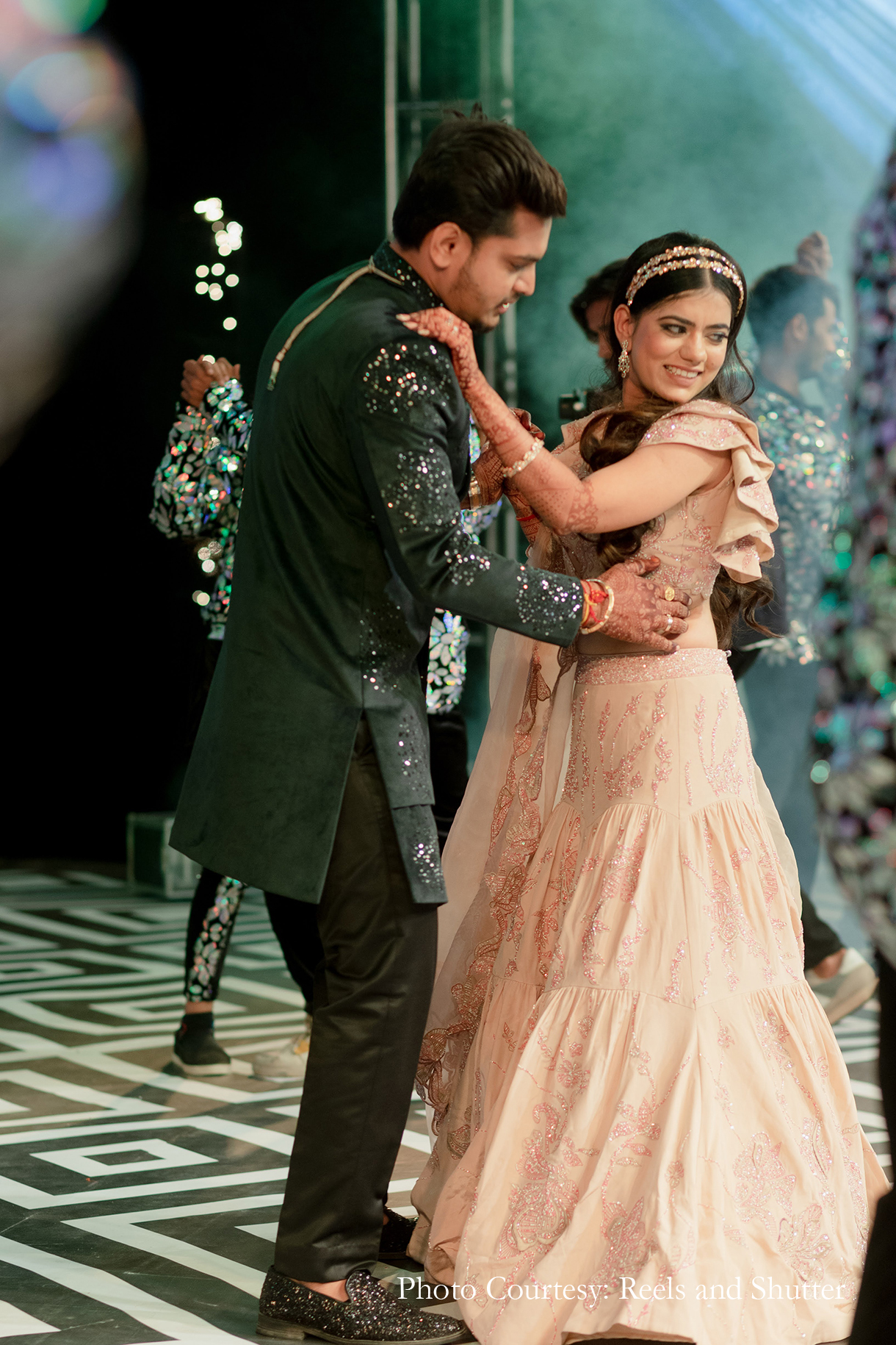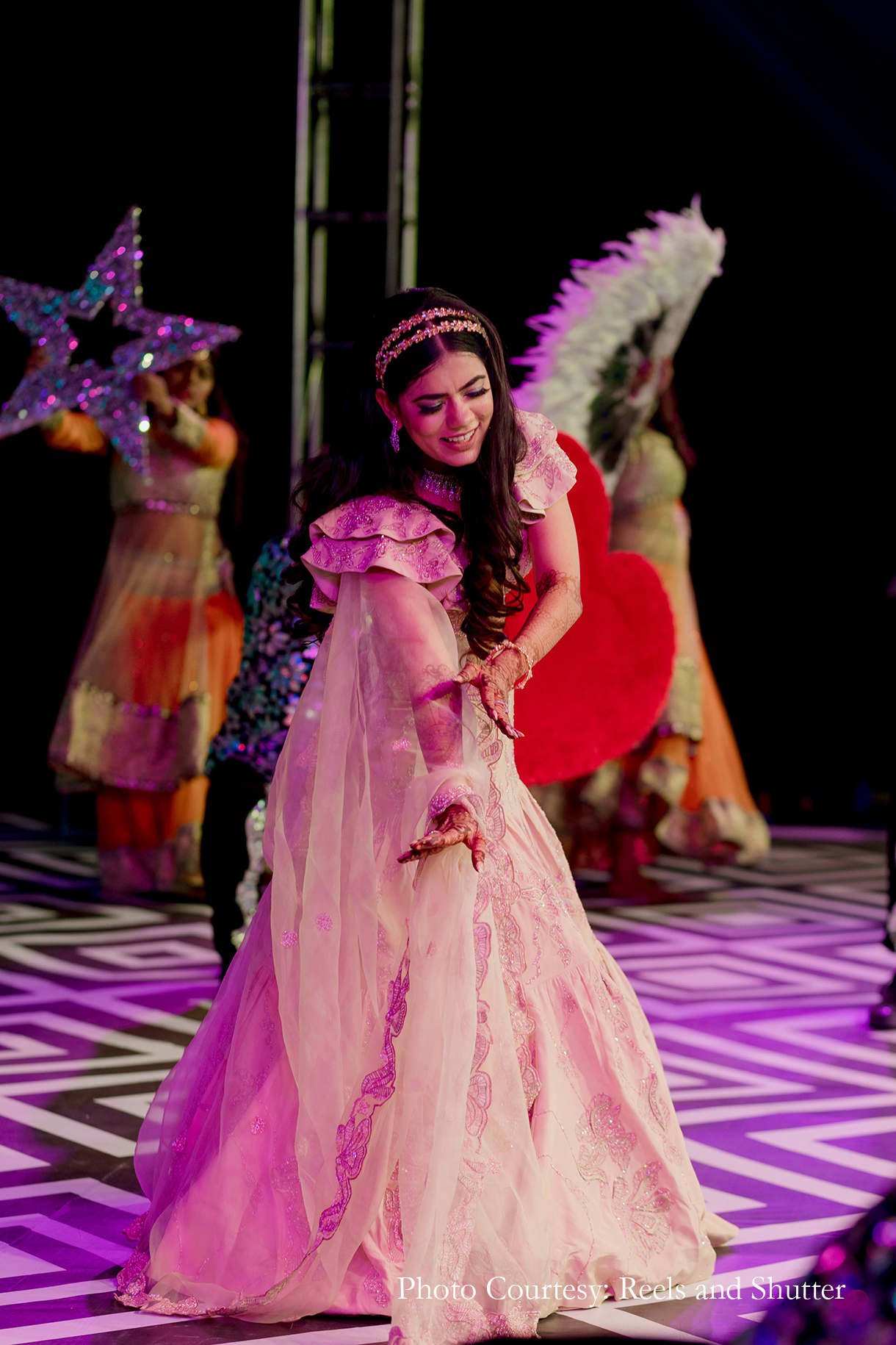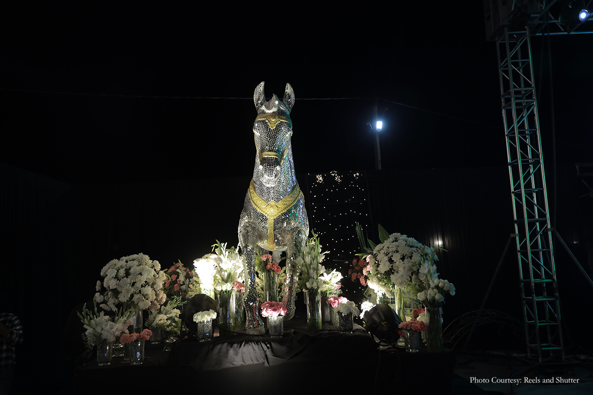 Mishal shares, “The sangeet again was on an open plot of land where we constructed a 120*100 ft trussing and gave the guests a clear view of the sky. The entrance was designed as a tunnel of 40 feet and for the side walls we used crushed papers and silver glitter for a glamorous look. The floor of the entry tunnel was acrylic with tube light lighting up the pathway and a chrome ceiling. The sidewalls included the couple’s portraits which were alternated by mirrors.” He goes on to add, “We also produced a diamond-shaped heart, installed chrome sheets and added baby’s breath blooms for the couple’s backdrop. The side tables consisted of neon signage with the couple’s hashtag.”
