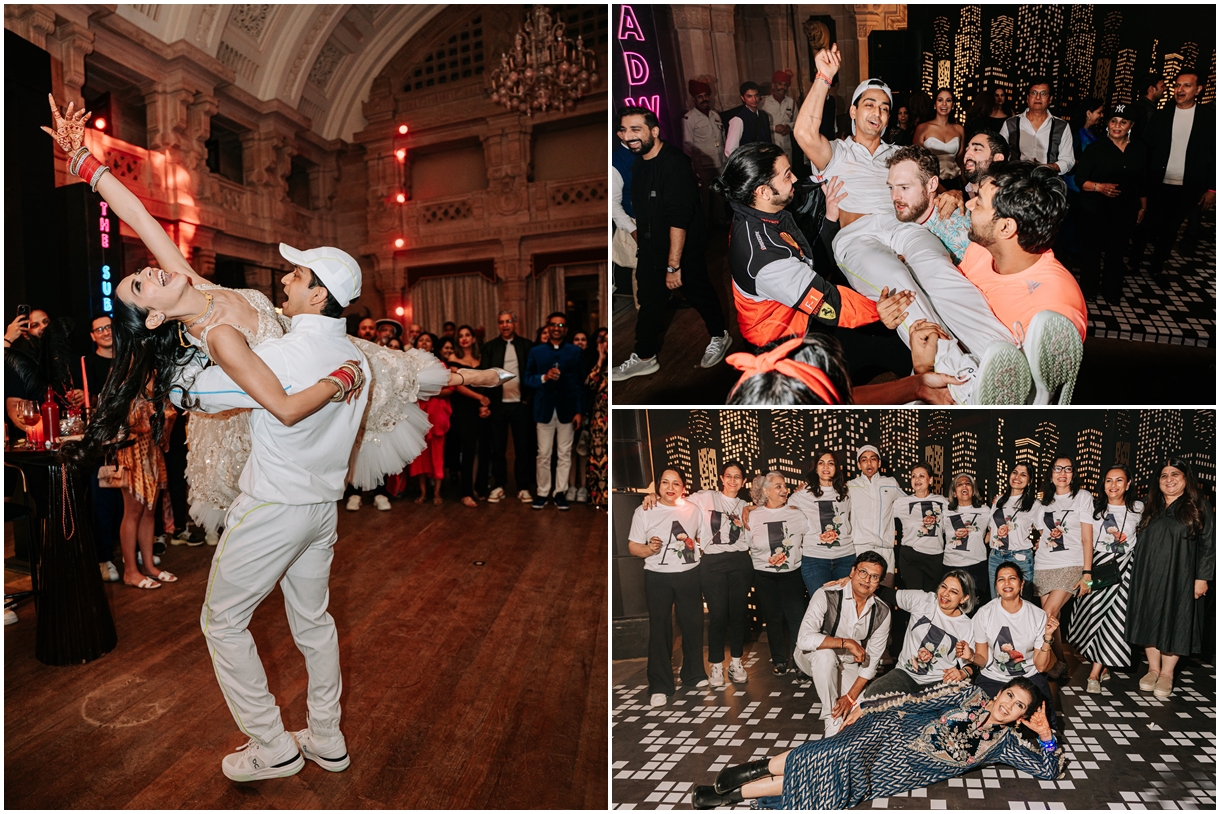 “Our ‘Sport vs. Stylish’ party, held right after the varmala and pheras, perfectly captured our personalities, Aditya’s love for sport and my passion for fashion,” shares Amala. “Instead of the traditional ‘bride’s side vs. groom’s side,’ guests dressed to match their vibe — sporty or stylish — and truly brought their A-game! The mix of glam black-tie looks and sporty chic made for great conversations and unforgettable moments. The décor was a tribute to New York, where our story began, complete with neon ‘SoHo’ and ‘Broadway’ signs and a glowing city skyline.”