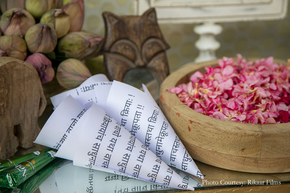 Imagined in a warm pink palette with earthy elements like cane furniture and jute rugs, the Mehndi exuded a bohemian spirit. Brightly patterned cushions and linens mingled with macrame art beneath a stunning canopy of inverted floral baskets, blending chic elegance with playful charm.