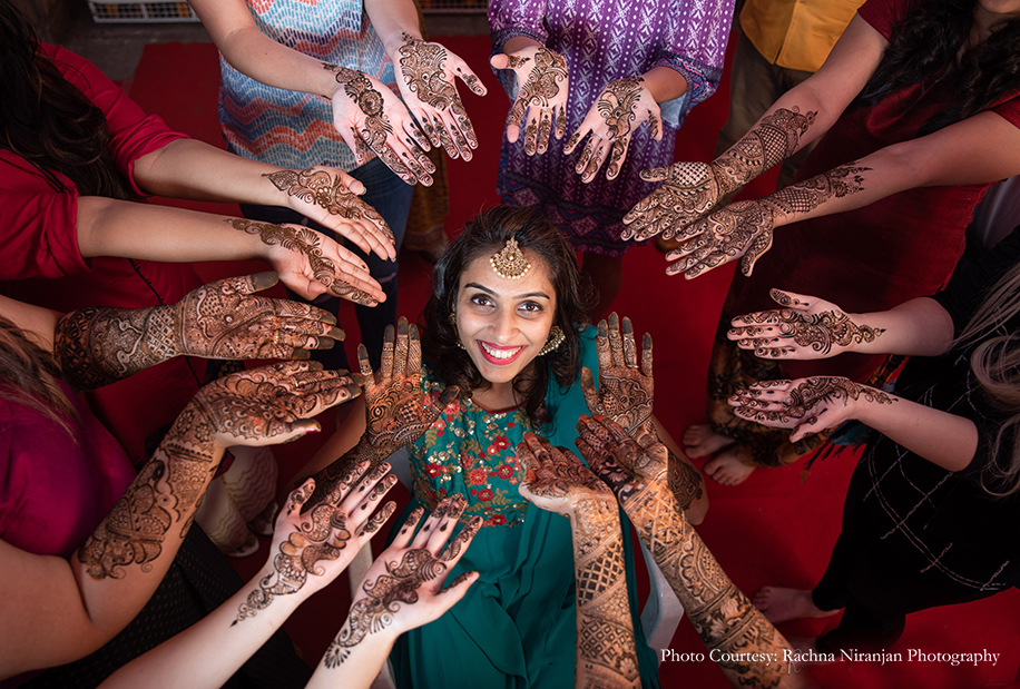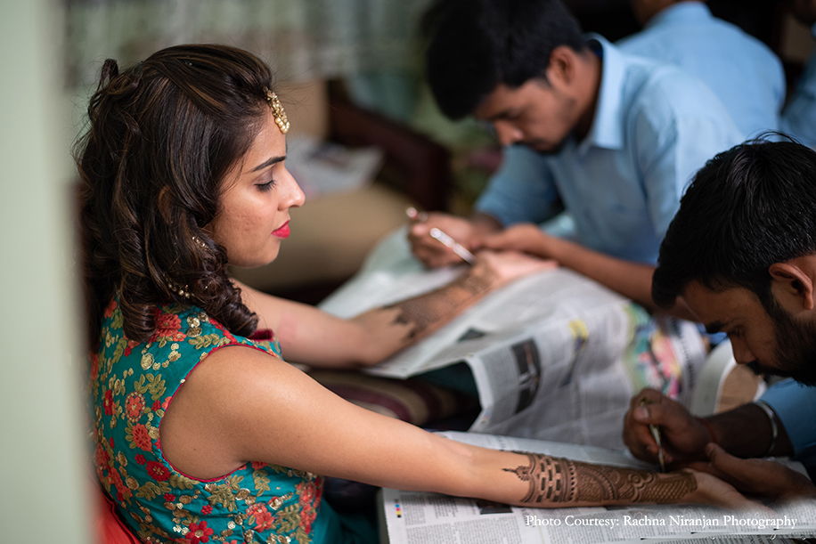 The wedding festivities began with the bride getting her hands traced with henna designs.