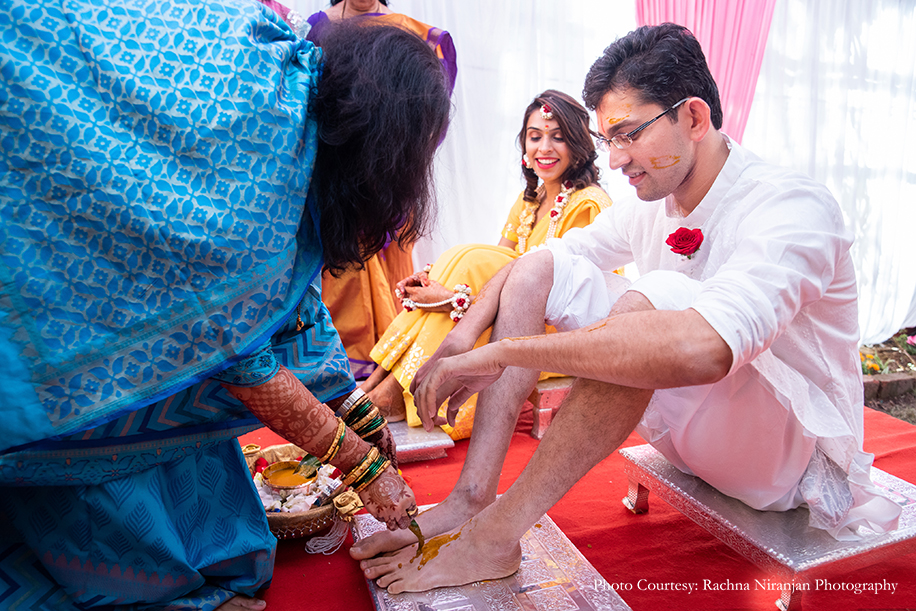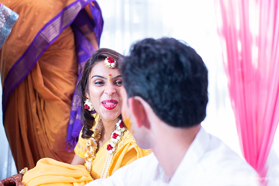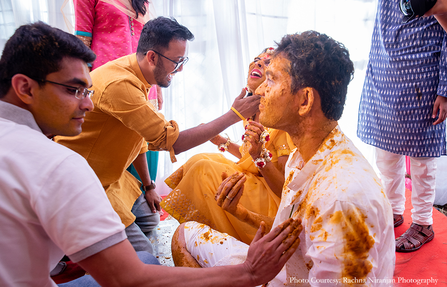 Draped in sunshine yellow, the bride sat beside her groom, both ready to be smeared with turmeric.