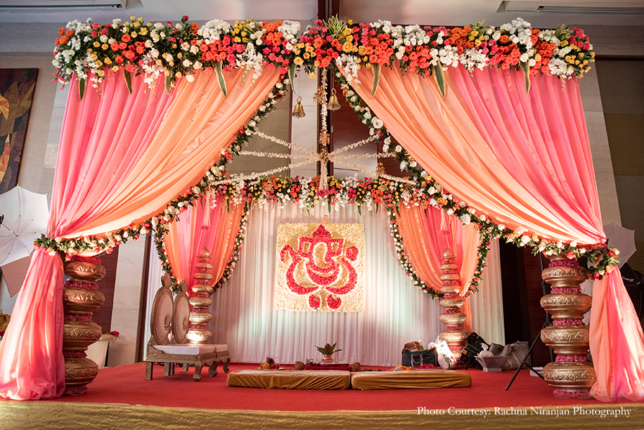 The mandap for the pheras was resplendent in pink and coral drapes, flowers and a beautiful floral Ganesha motif.