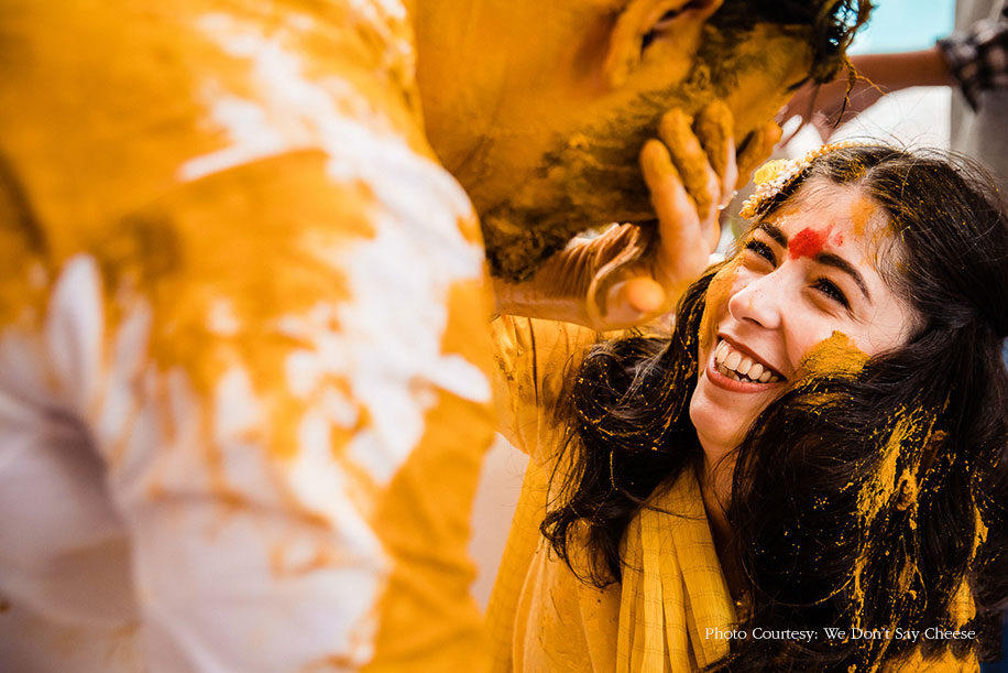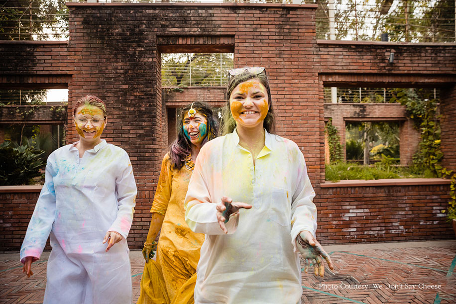 A traditional affair, the Haldi was a sunlit evening replete with marigolds and sumptuous Indian sweets that everyone enjoyed as they smeared each other with turmeric and color. Dressed in a yellow salwar kameez, the bride looked radiant as she played Holi with her groom who specially chose a pristine white kurta for the occasion.