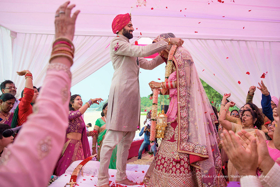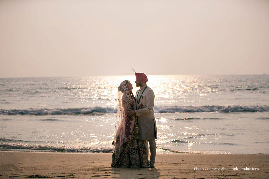 Traditional Sikh and Hindu wedding ceremonies were conducted in blissful serenity and friends and family gathered around to bless Ameet and Anesha. The nuptials were performed by the beach and the dress code was ‘Floral Hues’ with colors including shades of pink and purple. Anesha looked graceful in a Sabyasachi lehenga from the Udaipur collection, with a custom-designed bridal jewellery set. Ameet wore a Sherwani by Shantanu & Nikhil.