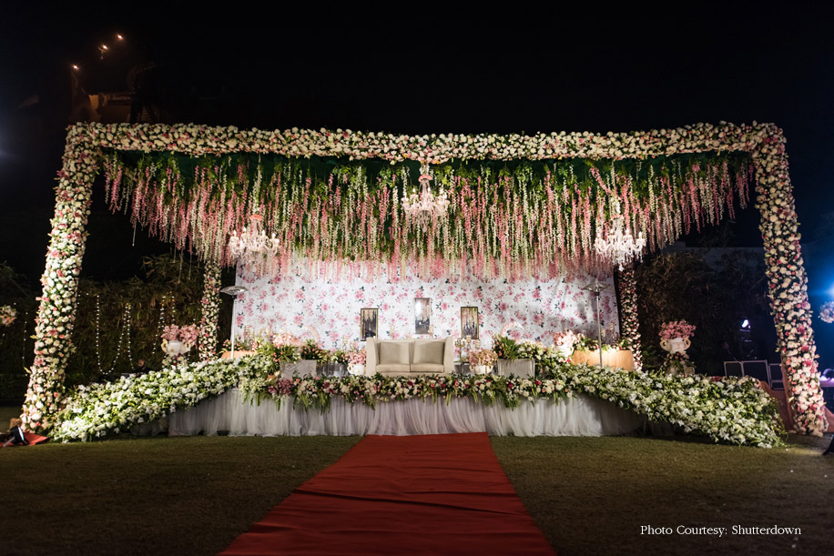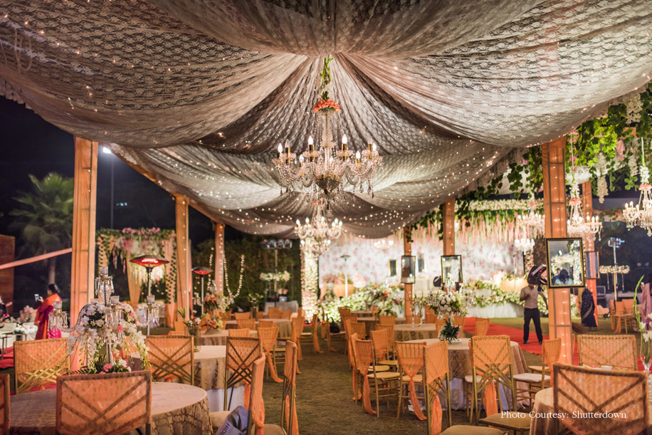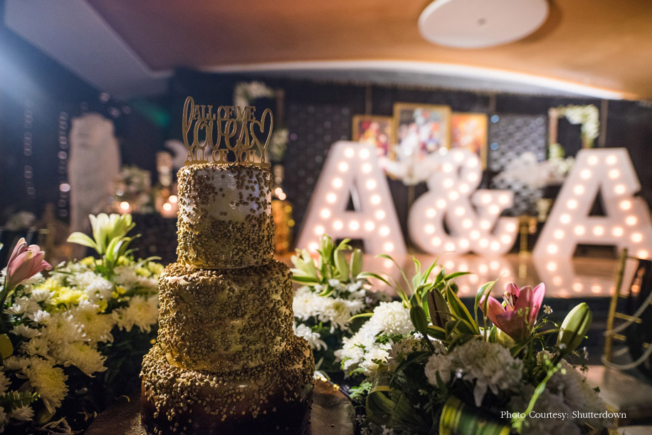 The color scheme for the cocktail party was black and gold based on the 1920’s Gatsby theme. It was a glamorous party. Anisha wore a burgundy gown paired with statement earrings while Aviral looked dapper in his classic black tuxedo. The décor included rich drapes and warm lighting with plays of light and sparkles thrown in. A stage built especially for the evening hosted a series of performers and the night was a grand success.