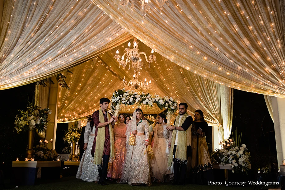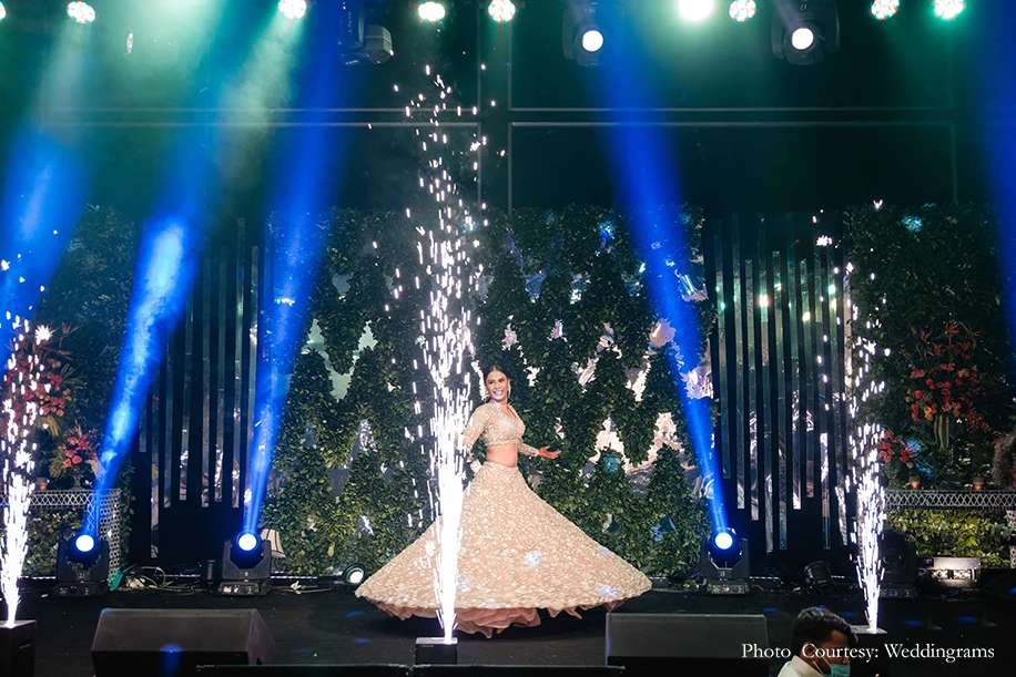 Hosted in the verdant expanse of Amarai Farms, the wedding was a whimsical affair replete with shimmering lights, flowing drapes, and ethereal decor. The bride matched the magical aura of the occasion with an exquisite peach lehenga by the Pakistani design house Suffuse by Sana Yasir, filled with intricate embroidery and embellishments. Fairy light canopies covered several parts of the venue giving the feel of a starry night to their festivity, while crystal chandeliers and exotic greens cast a magical feel to the outdoor occasion. Fireworks added an extra dose of oomph to the celebration.