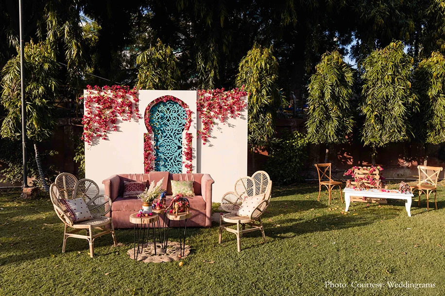 Hosted by The Fraternity Club, the sundowner Mehndi was a breezy blend of boho-chic decor elements. A striking arch walkway of foliage and pampas grass led into the venue, while dusty pastel drapes, quirky props, cane furniture, a stunning Greece-inspired backdrop and more, were used to create a charming, versatile ambience. Lounge lights and delicate chandeliers transitioned the function seamlessly from sunny moments to twilight revelries.
