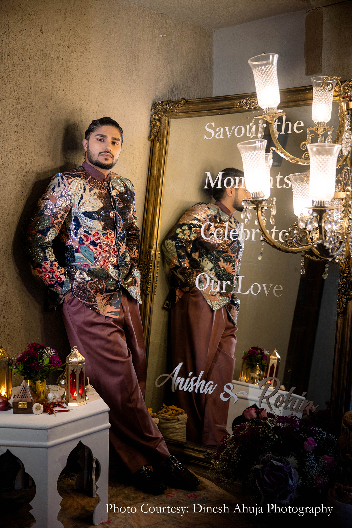 Festivities kicked off with a Mehndi celebration on Rohin’s terrace, transforming his home into a vibrant spectacle. The atmosphere was alive with a royal yet contemporary color scheme, featuring rich jewel tones and bursts of bright flowers. Velvet furnishings and intricate props added to the opulence, while the bride exuded a glamorous and edgy aura in her sequinned pant co-ord set by Kshitij Jalori.