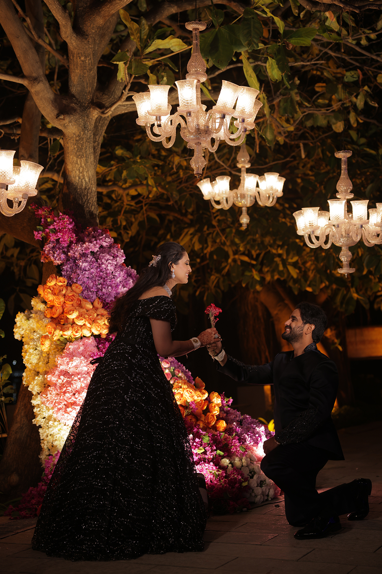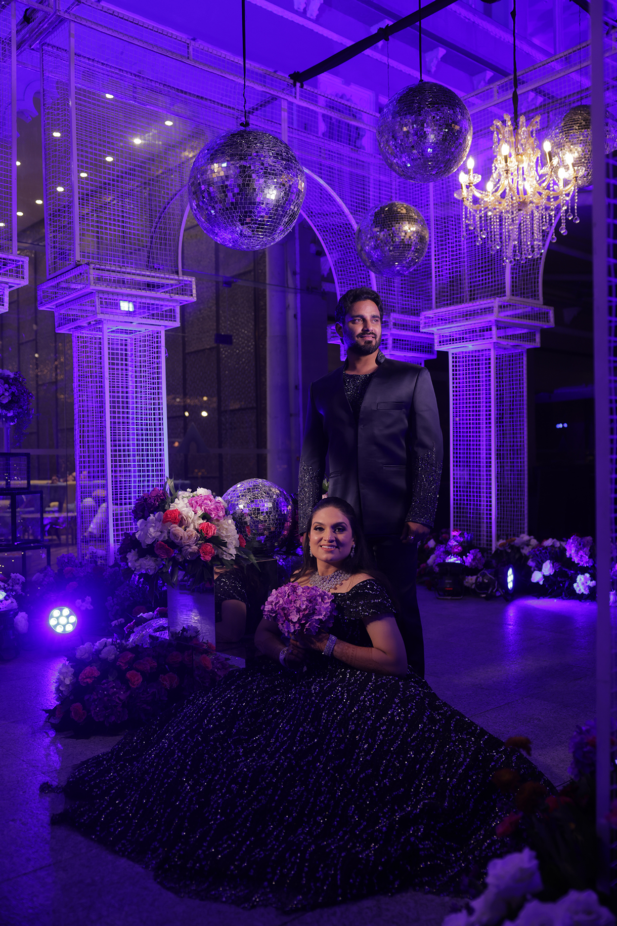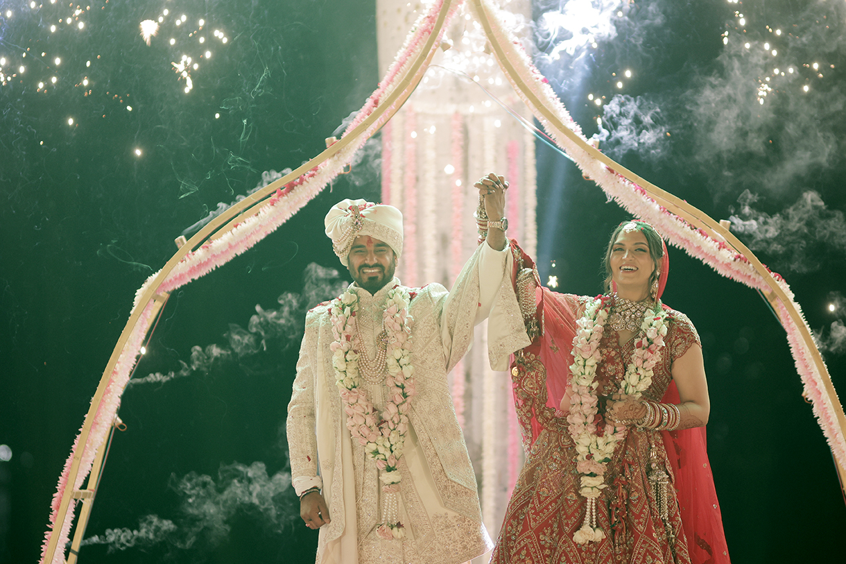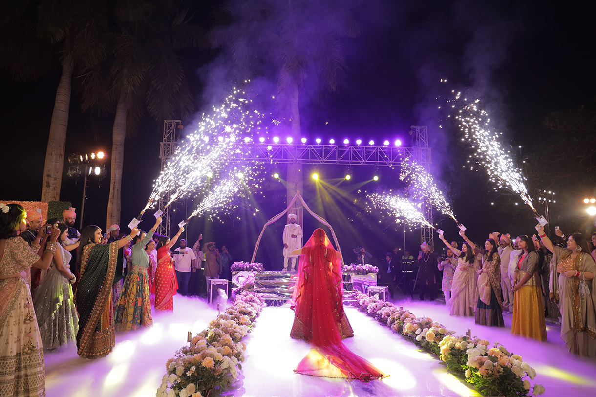 Inspired by Oscar elements, the opulent palette of gold, silver, and blue elegantly captured the essence of the Sangeet, inviting guests to discover their inner star. Dining beneath a canopy of stars, adorned with twinkling fairy lights and a vibrant LED screen that harmonized with the rhythm of the evening, created an electrifying atmosphere. The meticulously curated selection of spirits and bespoke cocktails crafted by the master mixologist set the stage for family and friends to showcase their talents in a dazzling display. Relatives from all corners gathered to perform, delivering a show that could rival Broadway itself. The evening was further enriched by the captivating anchors, the bride’s brother and father, who held the audience in rapt attention. A stunning champagne tower by Tushar and an exhilarating fire show by the bartender, honored the couple, while the highlight of the night was Anisha’s heartfelt audio-visual tribute, ‘Humari Pari Hai Tu.’ This touching presentation, featuring cherished photographs selected by her parents and accompanied by lyrics from her brother Akhilesh, along with a lively composition by her devoted sister-in-law Vijaya, evoked tears of joy and laughter from all in attendance.