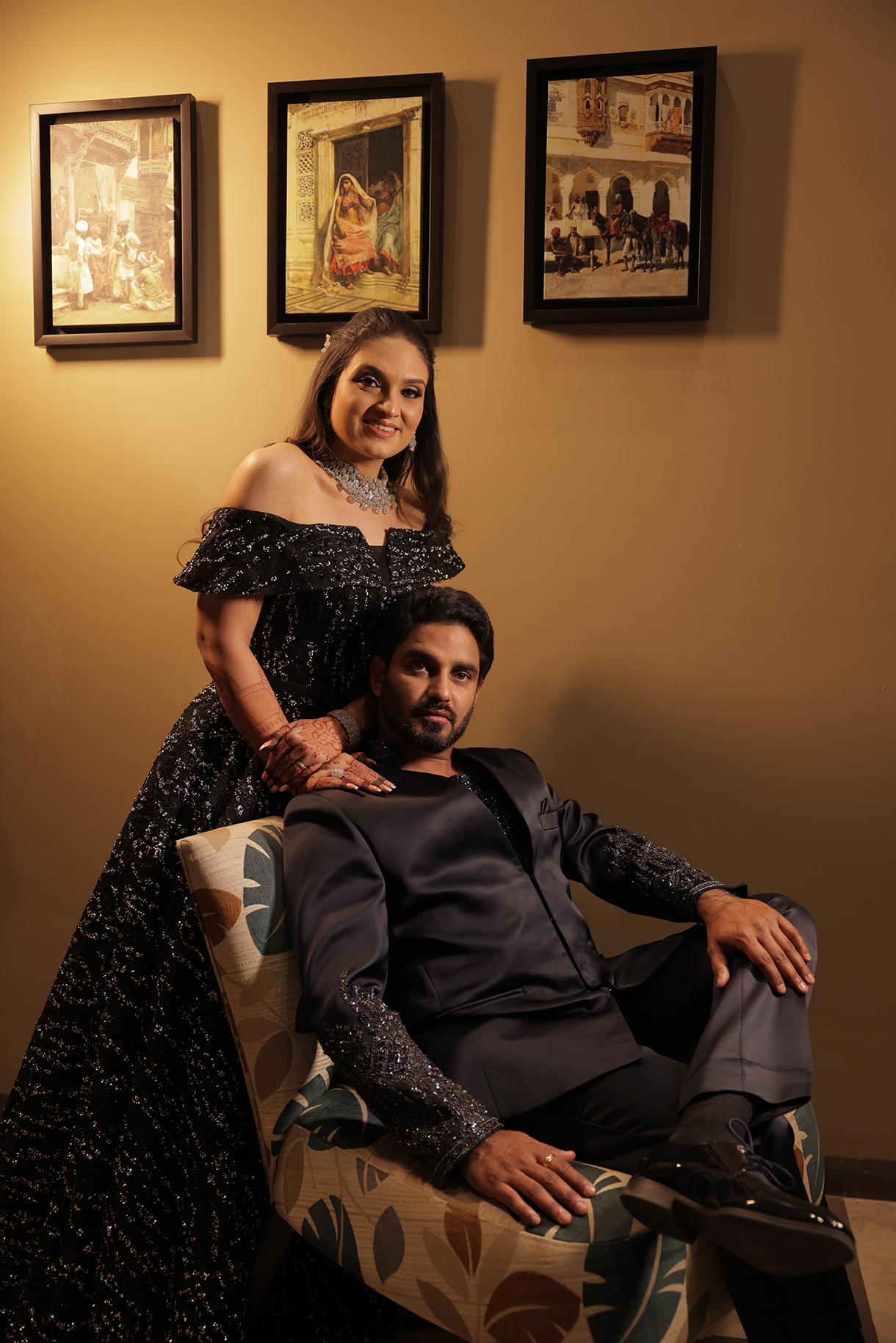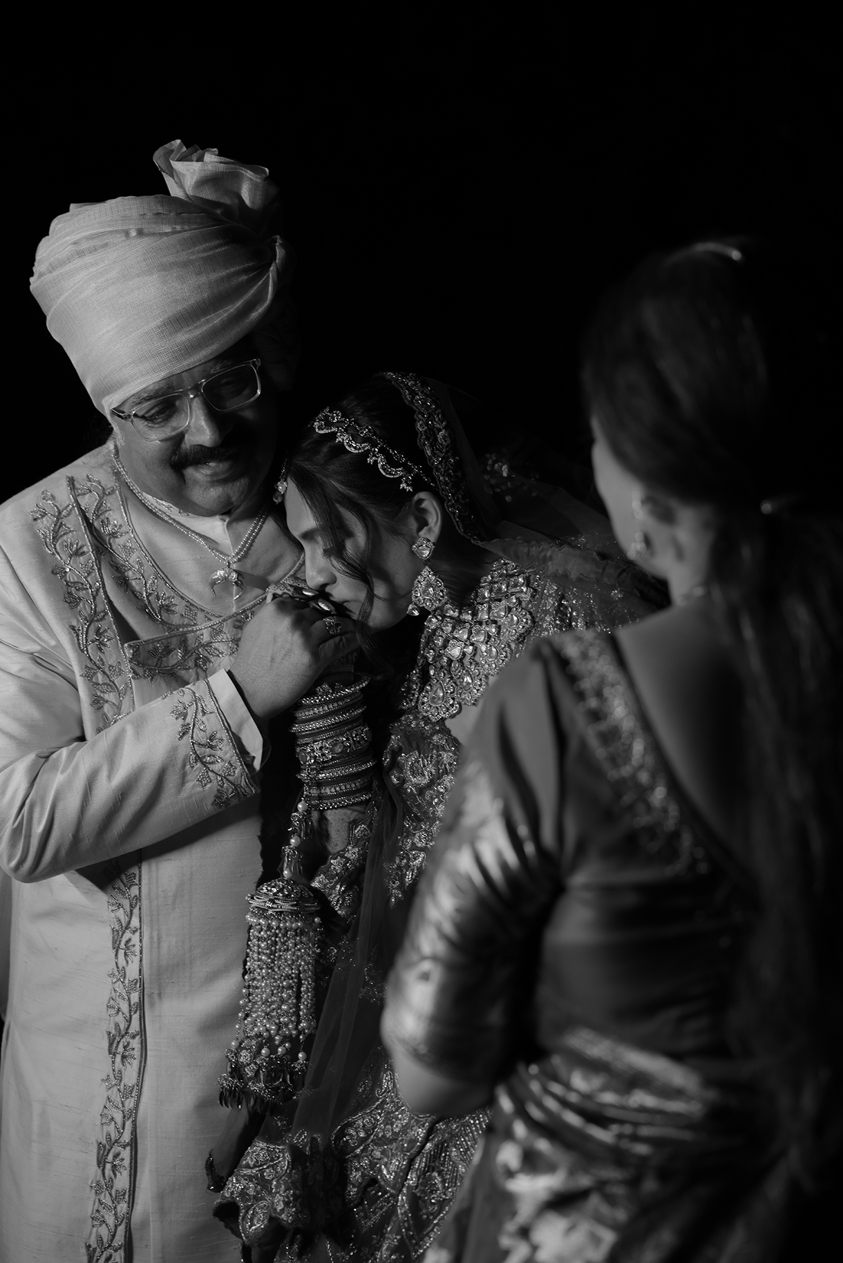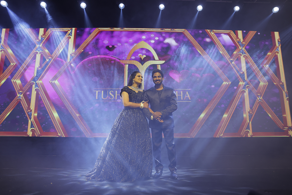 Inspired by Oscar elements, the opulent palette of gold, silver, and blue elegantly captured the essence of the Sangeet, inviting guests to discover their inner star. Dining beneath a canopy of stars, adorned with twinkling fairy lights and a vibrant LED screen that harmonized with the rhythm of the evening, created an electrifying atmosphere. The meticulously curated selection of spirits and bespoke cocktails crafted by the master mixologist set the stage for family and friends to showcase their talents in a dazzling display. Relatives from all corners gathered to perform, delivering a show that could rival Broadway itself. The evening was further enriched by the captivating anchors, the bride’s brother and father, who held the audience in rapt attention. A stunning champagne tower by Tushar and an exhilarating fire show by the bartender, honored the couple, while the highlight of the night was Anisha’s heartfelt audio-visual tribute, ‘Humari Pari Hai Tu.’ This touching presentation, featuring cherished photographs selected by her parents and accompanied by lyrics from her brother Akhilesh, along with a lively composition by her devoted sister-in-law Vijaya, evoked tears of joy and laughter from all in attendance.