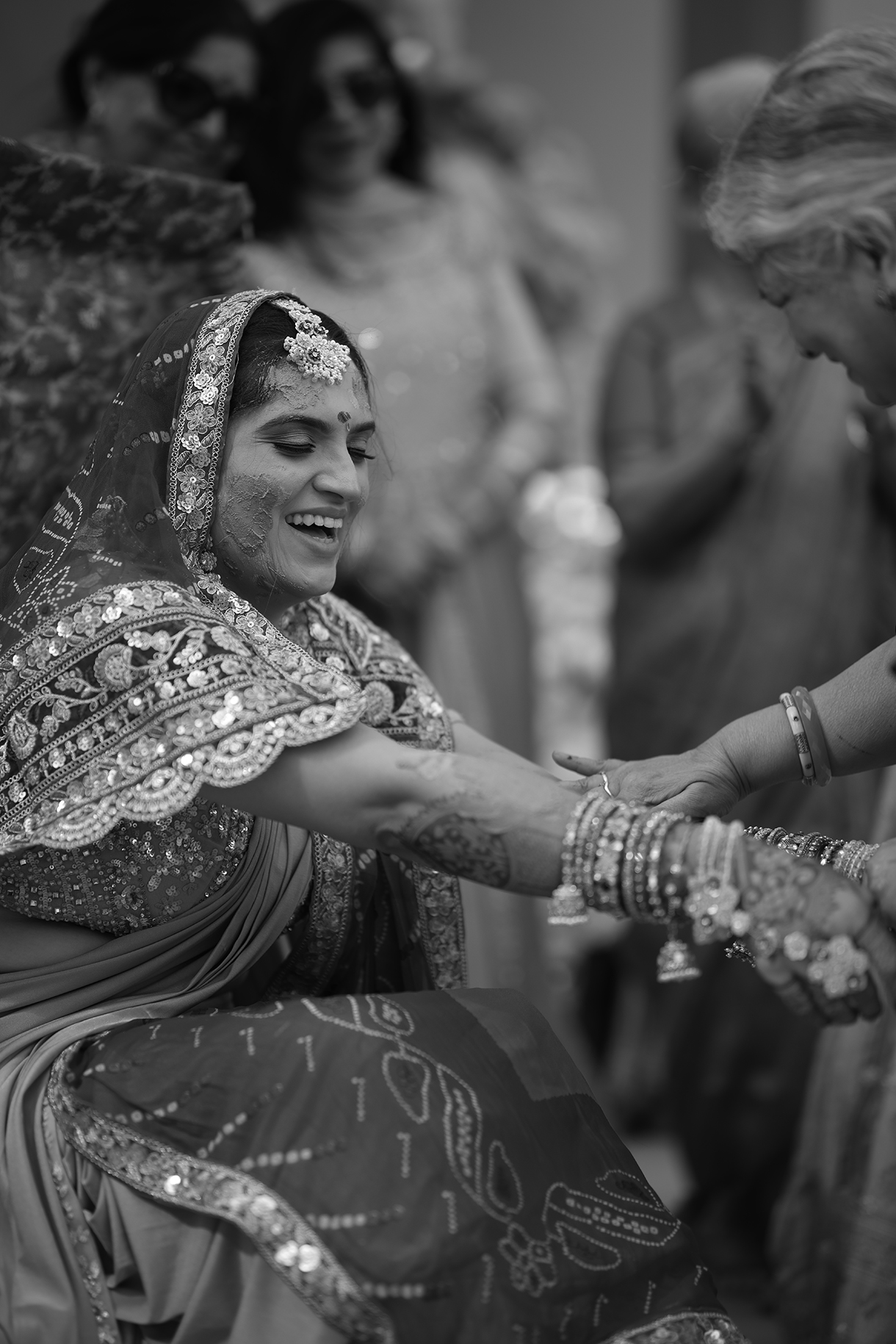 The Lakeside Raj Baug Lawns offered an exquisite backdrop for the Sehra Bandhi, which was perfectly situated for the Baraat procession and overlooked the serene Fatehsagar Lake. The venue’s charm was evident as guests captured selfies, while a delightful array of snacks, high tea, and cocktails charged the atmosphere. With a lively band and a special group of Dholis from Delhi, the energy was palpable, inviting the Baraatis to dance the Bhangra in exuberance. Adding a touch of elegance, the Nath Family’s vintage Buick Convertible graced the procession, infusing the event with a regal flair.