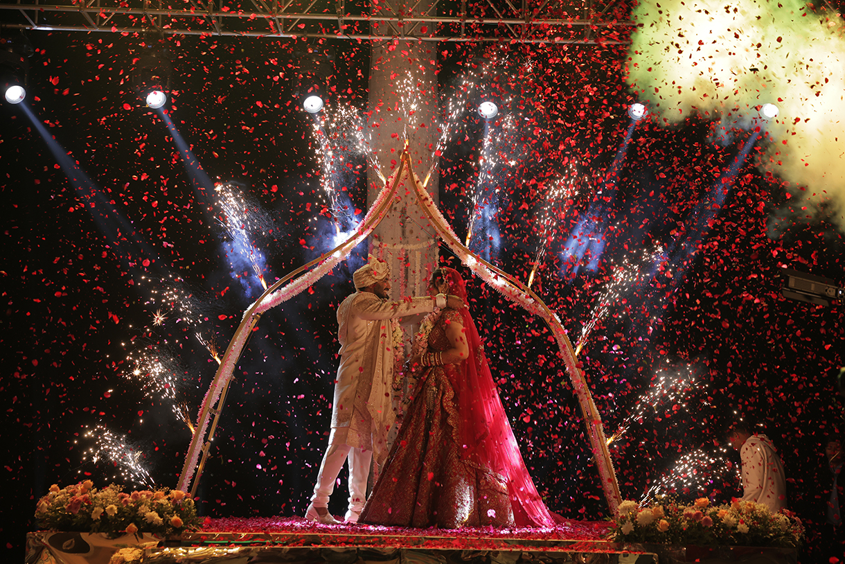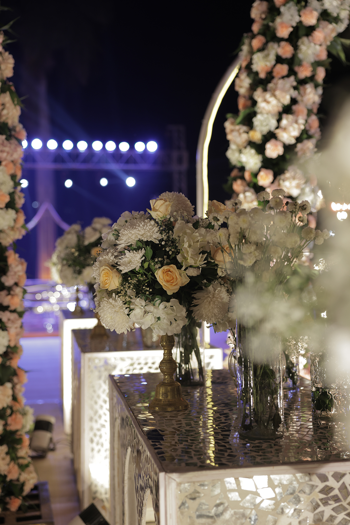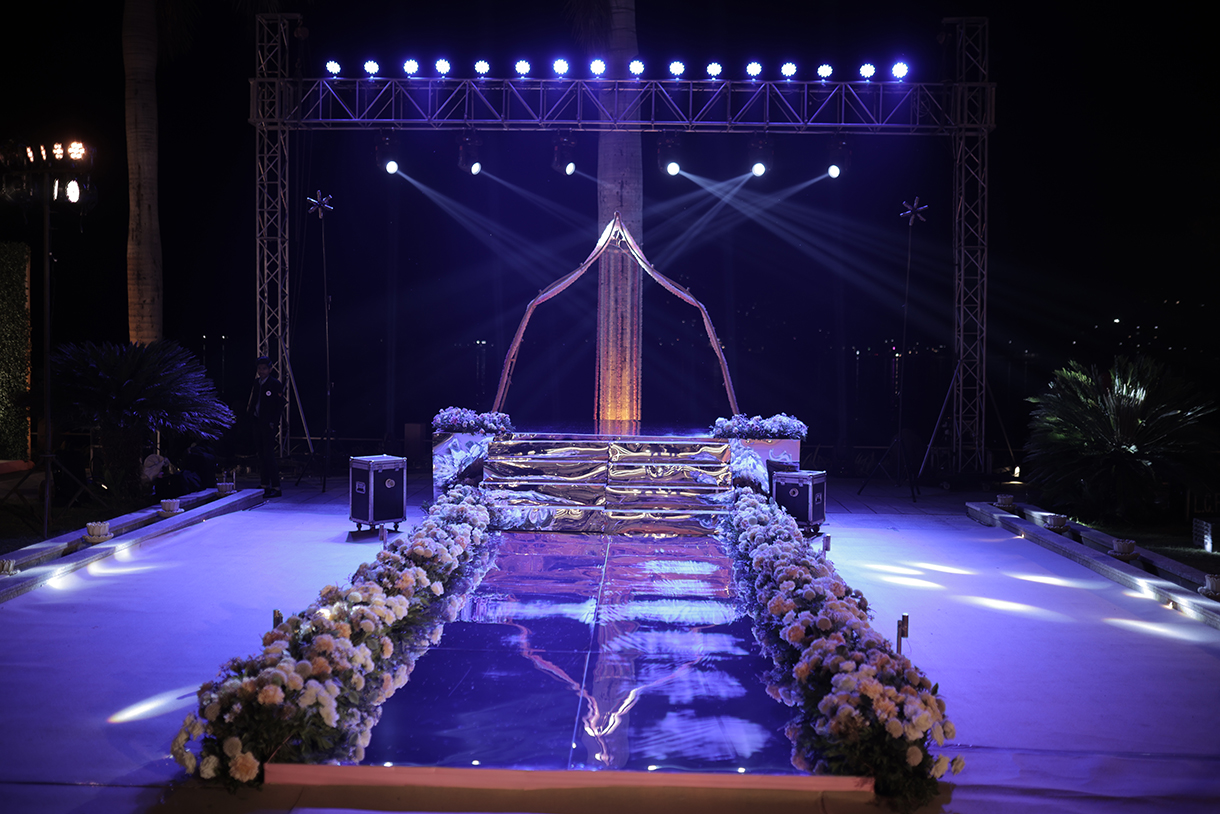 The culmination of many dreams and a year’s worth of planning, the exquisite wedding of Anisha and Tushar was a vision of elegance and sophistication. The delicate peach hues intertwined with subtle reds complemented the bride’s gown perfectly, setting the tone for a celebration steeped in class. A stunning podium for the varmala, framed by the serene lake, and an acrylic glass pathway for the bride’s entrance created a breathtaking ambiance, while the traditional sound of the “ShankhNaad” heralded her arrival. The enchanting pyrotechnics and Anisha’s graceful dance as she approached Tushar were flawlessly brought to life by Team Mosaic. A thoughtfully designed stage for family photographs prior to the phera ceremony allowed cherished moments to be captured.