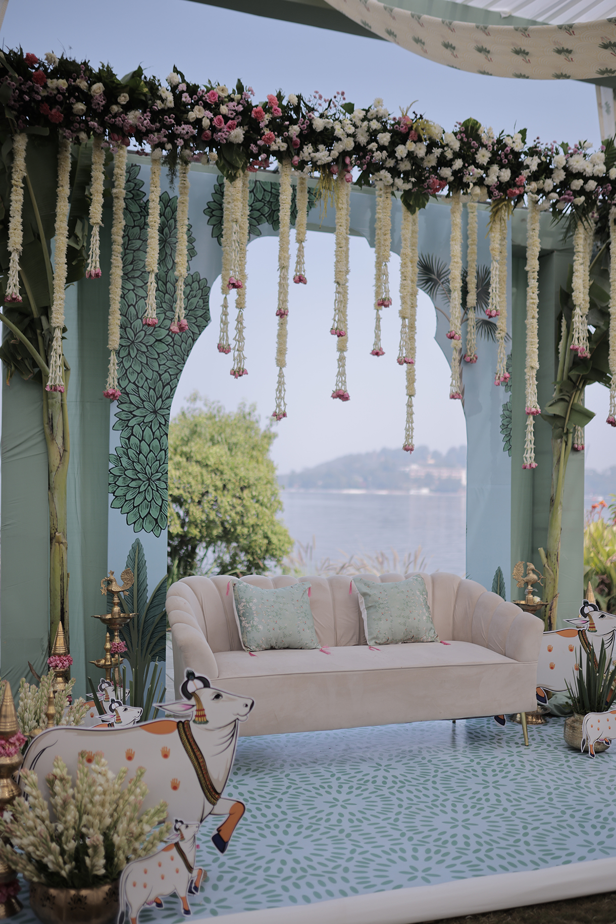 Given that the venue was a familiar one, it was essential to curate a décor and theme that diverged from the previous wedding. Anisha and Tushar were united in their vision for an elegant and sophisticated aesthetic that would not overshadow the stunning lake views and majestic mountains. Anisha’s lively spirit called for vibrant colors and floral arrangements, while Tushar preferred a more understated elegance. Their shared desire was for the décor and events to foster connections among guests.