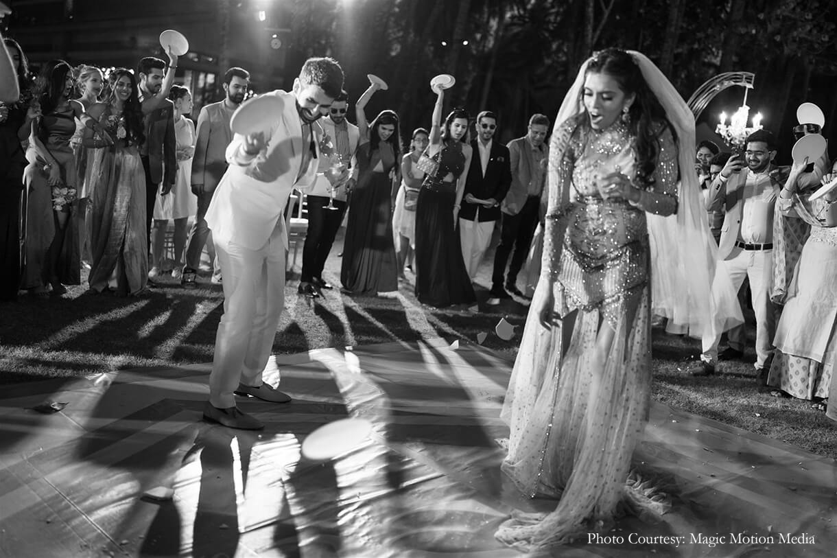 Inspired by the bride’s love for the show “Bridgerton”, the Cocktail soiree was imbibed with the elegance and decadence of Regency Era England, complete with letters from Lady Whistledown with secrets about the couple and masks for the guests. The bride dedicated her solo performance to her late father, dancing to the song “Papa Kenthi Hai Ladki bada Naam Karegi”, moving everyone to tears. The evening saw joyous toasts, cake-cutting, and a whole lot of dancing as they celebrated the newlyweds.