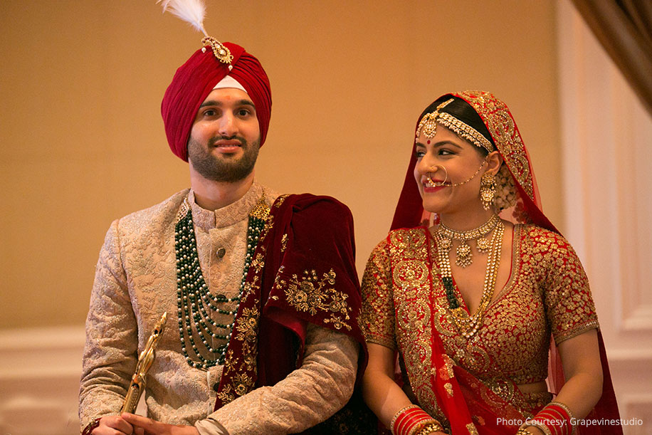 “To be a Sabyasachi bride is every girl’s dream and mine came true on my wedding day when I wore a stunning red lehenga for the ceremony. It was a traditional Sikh ceremony that took place indoors with all our loved ones in attendance. Karam looked like nothing short of royalty in this golden sherwani and maroon turban.”
