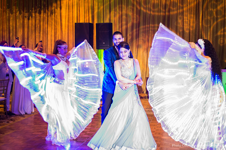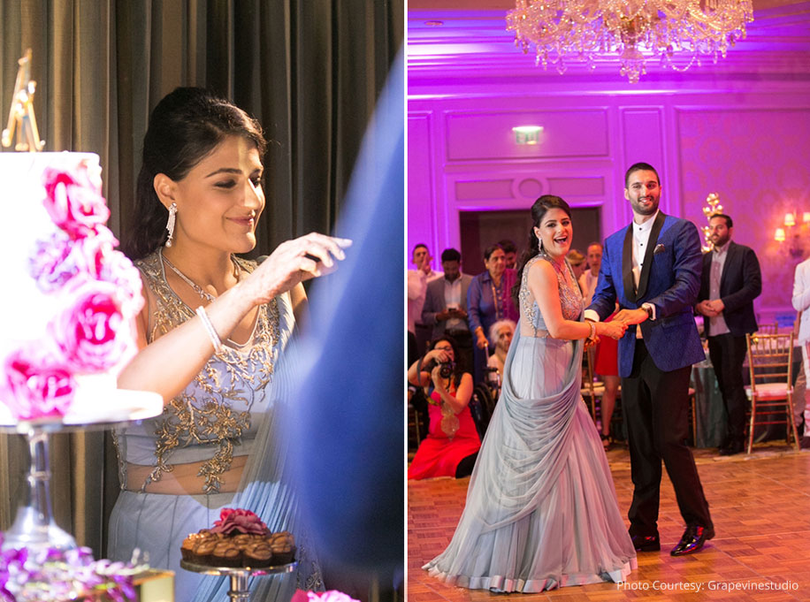 “Our reception was preceded by an outdoor cocktail hour. The venue for this function was breathtaking. It overlooked the beachside and the expansive oceans, and the sunset made the ambiance all the more beautiful. After this, everyone headed indoors for dinner. The soft golden lighting and the sophisticated table decor gave the venue and very refined look, and we had some professional performers light up the night. For this event, Karam wore a blue and black tuxedo while I opted for a light blue gown by designer Gaurav Gupta.”