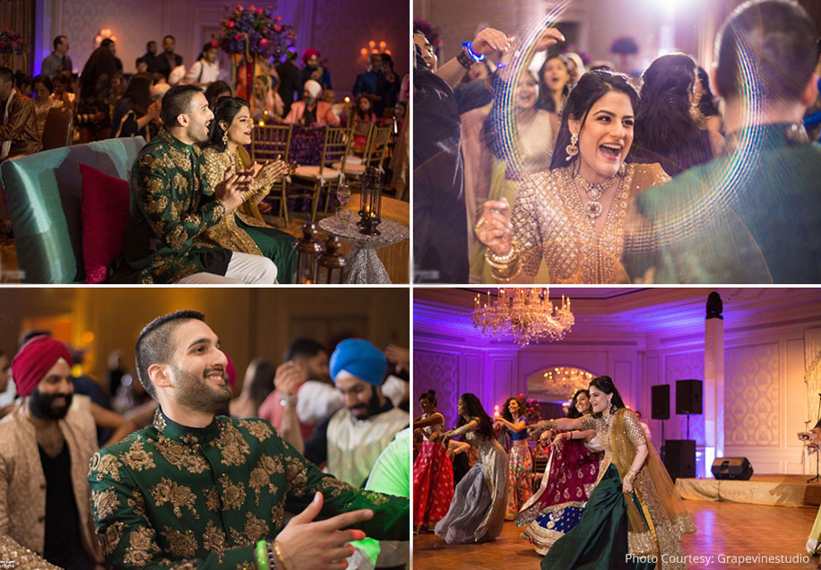 “Elegant floral table centerpieces were the key elements of the sangeet decor, which was further enhanced by the glow of Moroccan lamps that dotted the venue. We went for a more matching appearance for this function. I opted for a deep green lehenga with a long golden jacket-style blouse while Karam donned a bandhgala jacket that featured golden thread work. We had some of our closest friends and family performing for us, and it was truly special.”