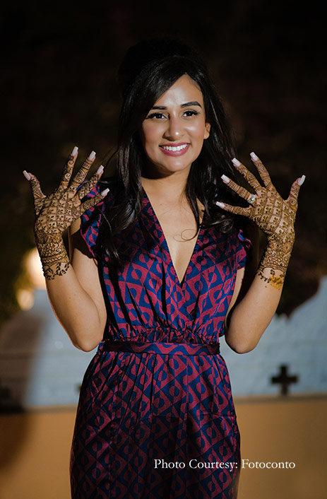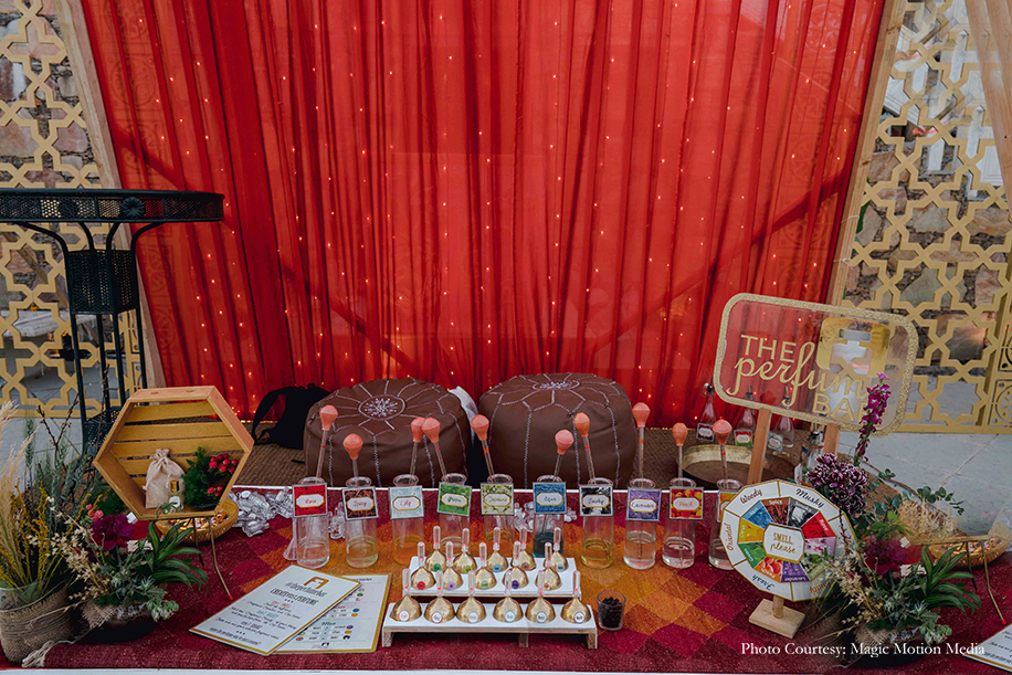 “The first event was our welcome party and mehndi. Since we’d envisioned a super chill vibe for the occasion, we went along with a Marrakech theme that, both, Ravi and I loved from the start. To keep the guests entertained, we had a parrot fortune teller and a spice cart. However, the final touch of flourish was added by a perfume bar, an idea suggested by our planner Divya from A Klass Apart, where everyone made their own customized scents. As the air was heavily infused with the scents of oud, it was quite easy for everyone to forget where they actually were and they got transported dreamily to Marrakech for the evening.”