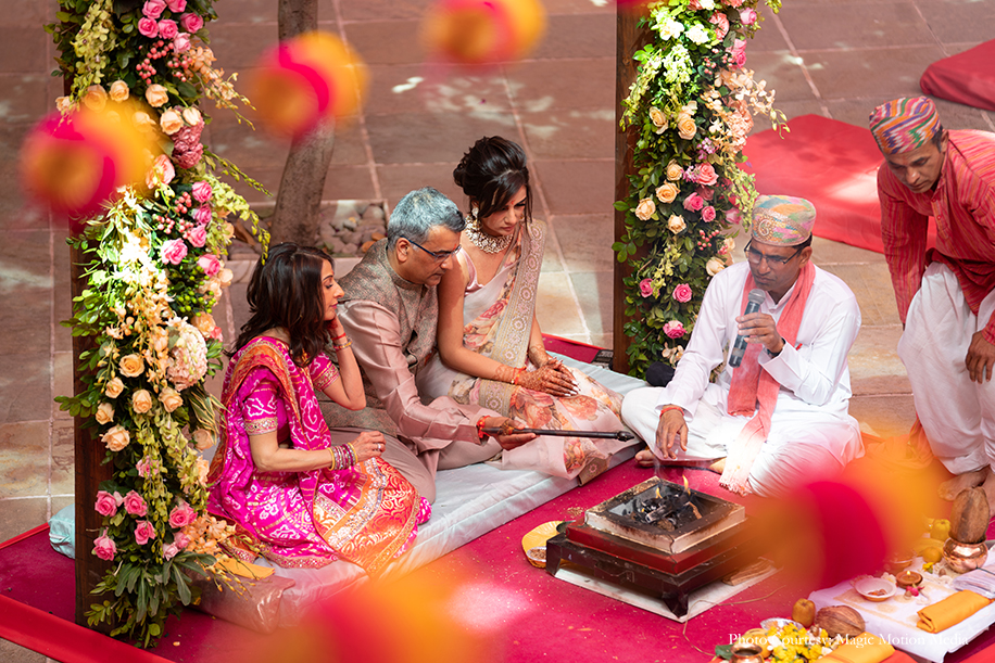 “The following morning, we had a Ganesh puja followed by the haldi ceremony where we went for a yellow, pink, and red color palette. Owing to the fact that it was a morning function, we thought it would be best to have bright colors under the glaring Rajasthani sun. Additionally, showcasing her detail-oriented nature, our planner Divya, who knew that I loved origami birds, thoughtfully hung them throughout the courtyard along with cute pom pom strings.