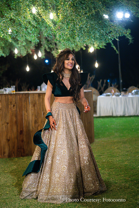 “Following an ‘Enchanted Forest’ theme, our sangeet was a dazzling affair, and since both of us love Disney, we chose to incorporate a magical theme into one of our functions. However, the challenge that lay ahead of us was to execute it in an elegant manner. I think our decor team rose fantastically to the occasion and awed all the guests with their efforts and attention to detail. With cocktails like ‘Popping Candy’ and ‘Candy Floss,’ a botanical gin bar and Disney-named tables adorned with customized art by Bombay based artist – Hiral Mehta, all our guests raved about the setup. I opted to keep my lehenga skirt from the wedding on, but added a dash of contemporary style to the look with a forest green velvet blouse that had wing sleeves.”