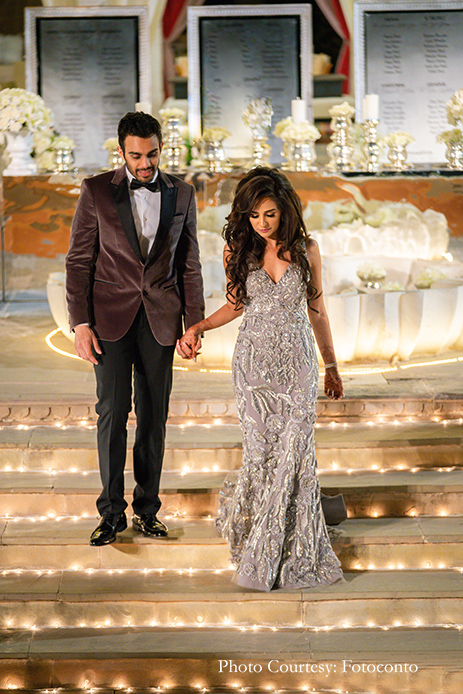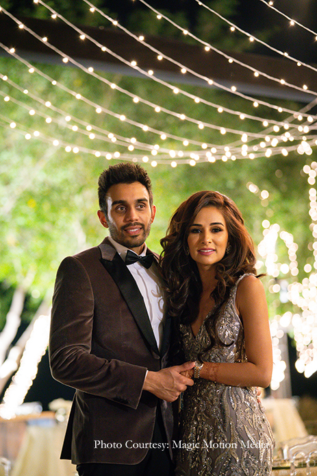“To end our wedding festivities on a high note, we hosted a gorgeous black-tie reception. With saxophonist Ryan Sadri playing his amazing tunes, we had a long drinks reception which set the tone for the rest of the evening. The decor followed a ‘White & Mirrored’ theme which included tabletops studded with mirror work, pristine white floral centerpieces, candles and fairy lights. The lights especially played a crucial theme in brightening up the entire venue and added a magical touch to the evening. For this function, I opted for a silver Manish Malhotra gown and Ravi wore a Hugo Boss Grey Velvet tuxedo. However, as the evening progressed, we were in for a treat as Ravi played the piano which left everyone spellbound.”