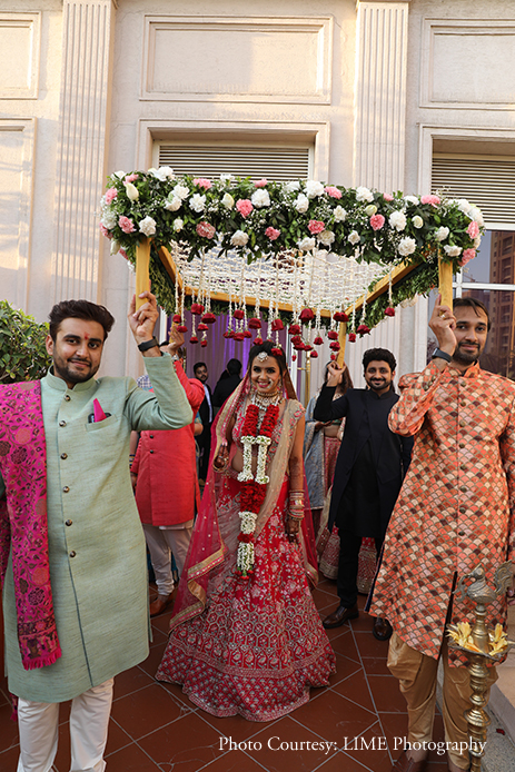 The beautiful bride donned a heavily embroidered lehenga choli by Kalki Fashion. Her look was completed with a smoky eye makeup and a gorgeous floral bun. The groom wore an ivory sherwani with floral embroidery along with a regal golden Safa. The wedding ceremony was an open-air event held at the ITC Grand Central, Mumbai. She made a grand entry at the wedding ceremony under a phoolon ki chaadar held by her brothers.