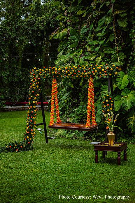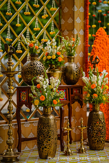 Using yellow and orange marigold blooms innovatively, this couple’s engagement decor stood out with its vibrant beauty.