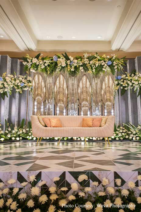 Charannya adds, “We wanted to create something classy and elegant, we didn’t want to go about it the usual way. The acrylic panels got a curvy twist with florals decked up on top and bottom. The matte stripes on the sides went beautifully with the shiny acrylic center. To dismiss the monotony we introduced levels in terms of placements of panels which created depth and visual play. The aisle, however, was the highlight with long-stemmed white flowers adorning the sides of a radiant acrylic platform.”