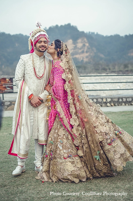 Surrounded by raw natural beauty and canopied by a light blue sky, the Wedding was whimsical following the theme ‘Spark of nature’. As the groom entered with a lively baraat, the day looked picture perfect surrounded by tall trees and lit up by sunlight. After the Wedding ceremony, the couple also clicked some beautiful pics against the backdrop of the hills and the gentle flowing Kosi River.