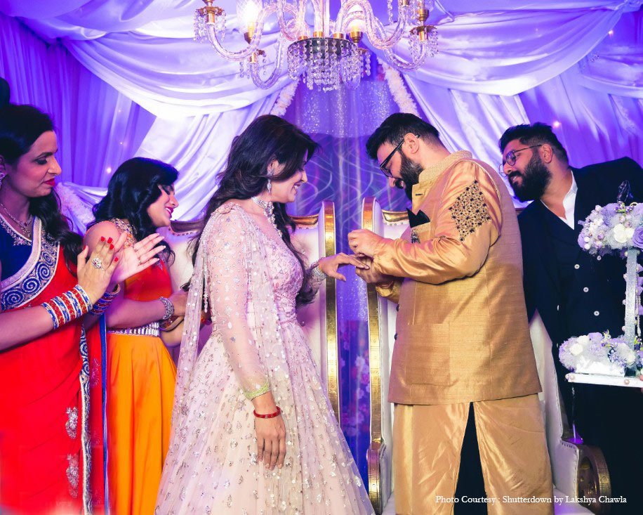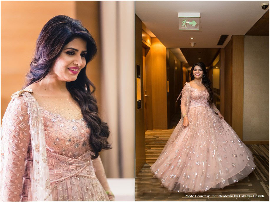 “The engagement decor was based on an English theme where we used a lot of exotic flowers and flower canopies over the dinner tables. The seating featured a floral cabana with a lot of candles.” Anu looked gorgeous in a pink net lehenga by Tarun Tahiliani at this function.