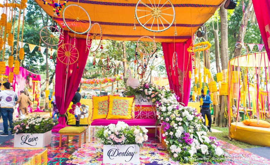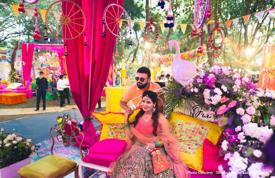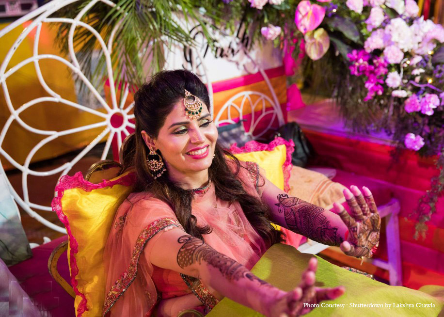 “The mehndi decor was very colorful. Diwans were placed for the guests to sit on and get beautiful mehndi designs applied to their hands. A seating arrangement was done on a cabana with a raised platform that had flower chakras with little woolen tassel hangings. On the other side, another big stage setup was raised with a band set up for the performance of famous Bollywood singer Neha Bhasin. ‘Sharab-Di-Gaddi’ was the cocktail section. Carts offering giveaways such as dupattas and bangles for guests and a digital slingshot for the photo booth were some of the highlights. Anu wore a green and peach lehenga by Shyamal & Bhumika for this function.”