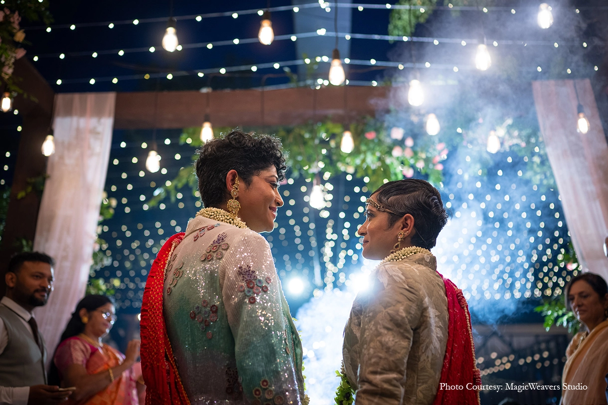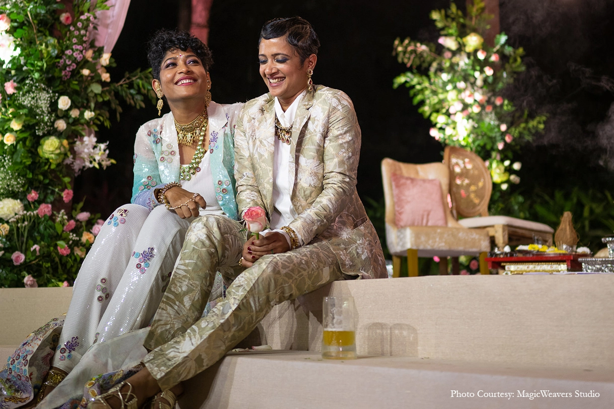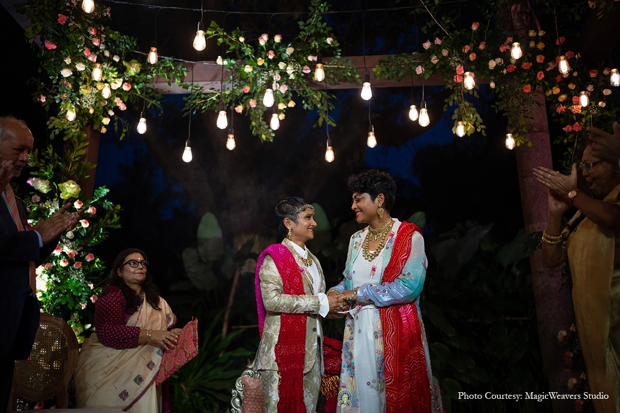 With a surreal decor that merged flawlessly with the resort’s greenery, the couple’s wedding looked dreamy. As Anuja and Rupa made their way down the flower-lined aisle, they were preceded by their adorable pet dog. Decked up in white and pink blooms the wedding mandap was lip up by vintage bulbs. And, to ensure that the guests had a clear view of the rituals, comfy cane chairs were strategically placed around the wedding mandap. After the wedding, the couple moved indoors to the Udeta Ballroom where they had a post-wedding celebration.