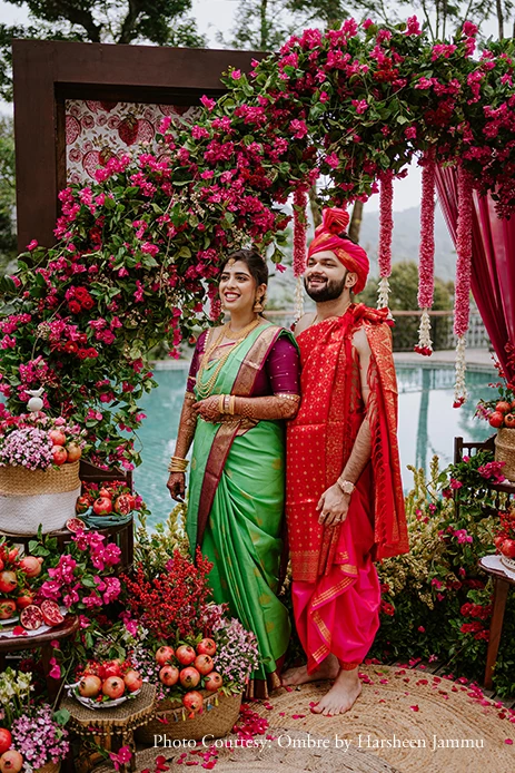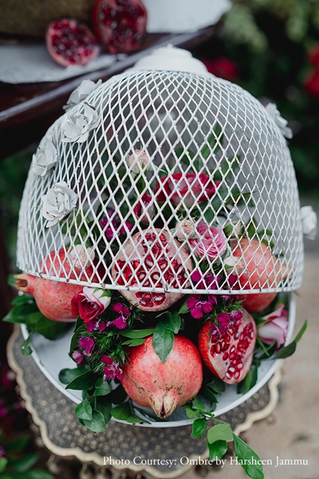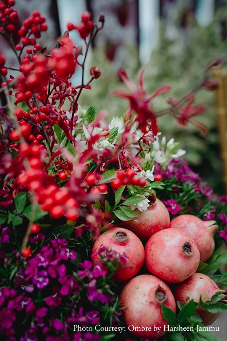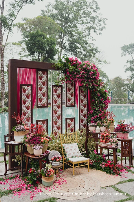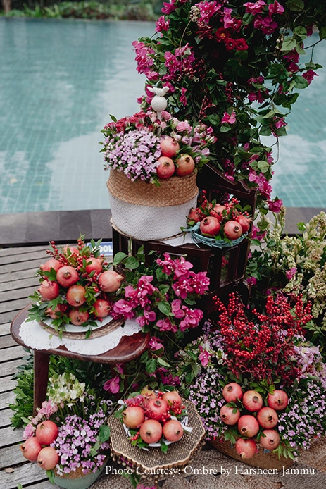 A traditional Konkani wedding ritual where the bride and groom grind black gram together to symbolize the bride’s entry into her new household, Anusha and Govind’s Uddha muhurta was a heartwarming affair. Highly inspired by the rich pomegranate or anar fruit, the decor was a quirky blend of indo-western elements like birds, berries, and foliage. Set against the backdrop of a pool, the cushions and jute mats made everyone feel comfy as they mingled with each other.