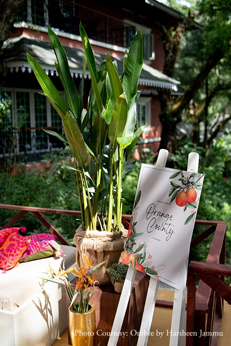 Taking a cue from the renowned Orange County in Coorg, the decor for the Haldi was unique with citrus fruits peppered amongst the bright orange marigold blooms. To add a traditional Indian twist to the decor, the furnishings were accentuated by kutch work cushions on which the guests lounged while feasting their eyes on the surrounding mountainscape. Anusha adds, “It was absolutely beautiful and decor made it so much fun! Everyone had a great time and the guests were overjoyed when presented with DIY jewelry.”