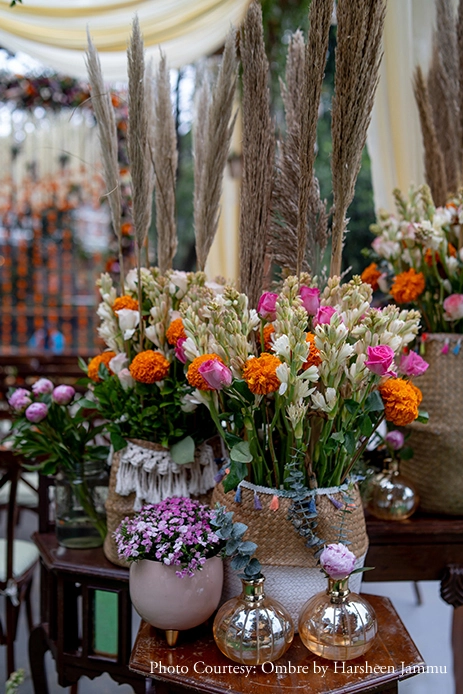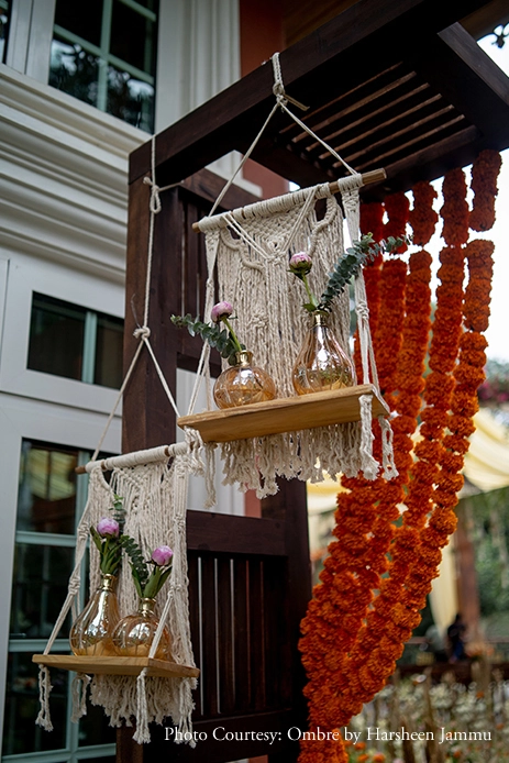 Keeping in mind the mountainous vistas that surrounded them, the couple decided to take a rustic and bohemian route for their big day. Using wood, bamboo, jute and macrame which was complemented by blooms like marigolds, peonies, and bougainvillea, the wedding day was all about bright, happy colors. With their loved ones in attendance, Anusha and Govind radiated happiness as they exchanged garlands.