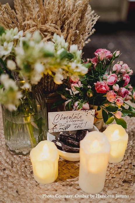 Inspired by the couple’s Konkani roots and the natural beauty of the venue, the Mehndi followed a ‘tropical konkan bliss’ theme. Adorned with areca palms, jute rugs, cane furniture, coconuts, and quirky prints that matched the existing furniture, the decor created a vibrant setting that gave the wedding festivities a cheerful start! The bride recollects, “Chocolates that were especially crafted in Coorg were placed in different nooks and corners to symbolize the venue and to treat the guests as they celebrated.”