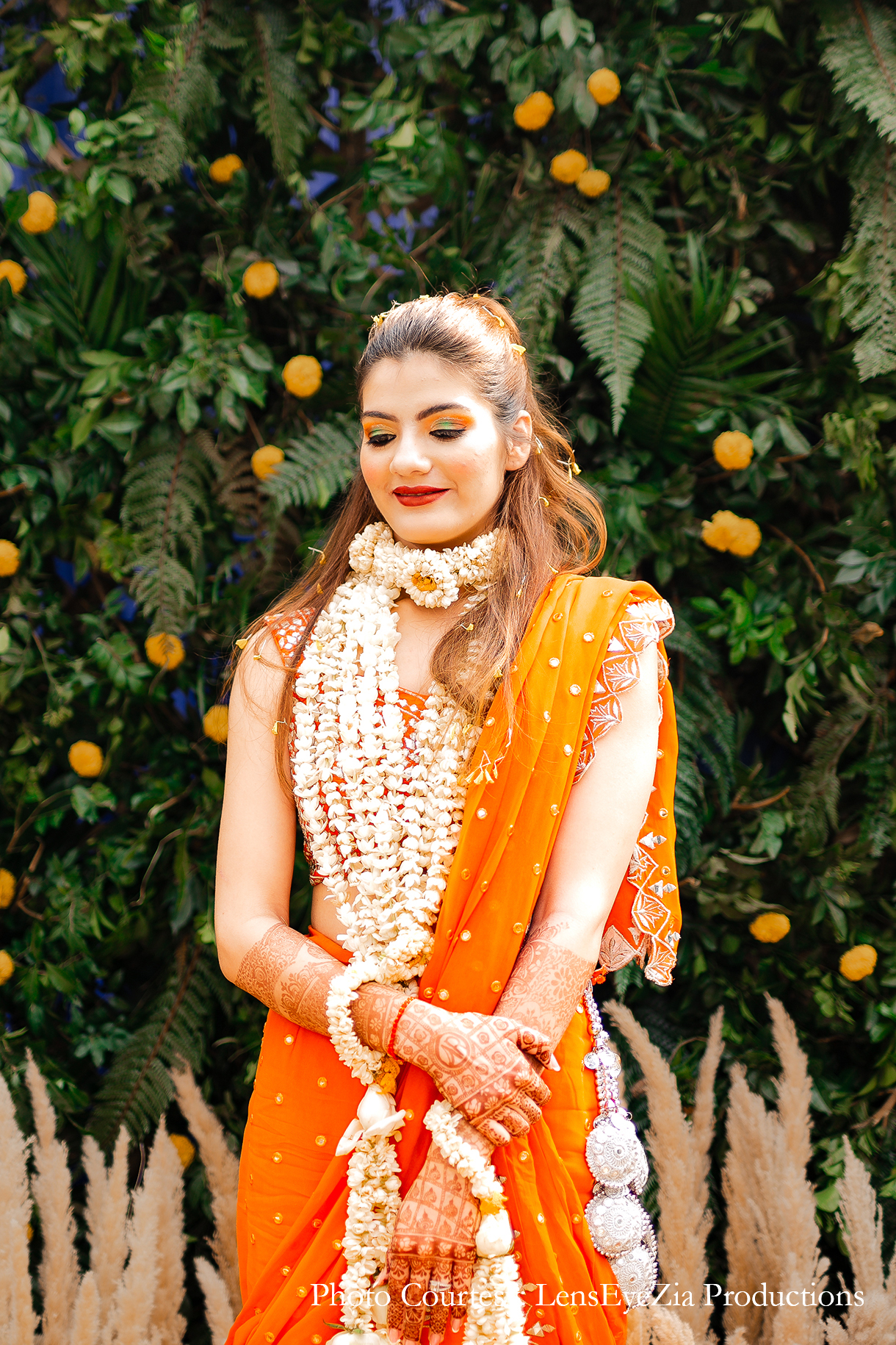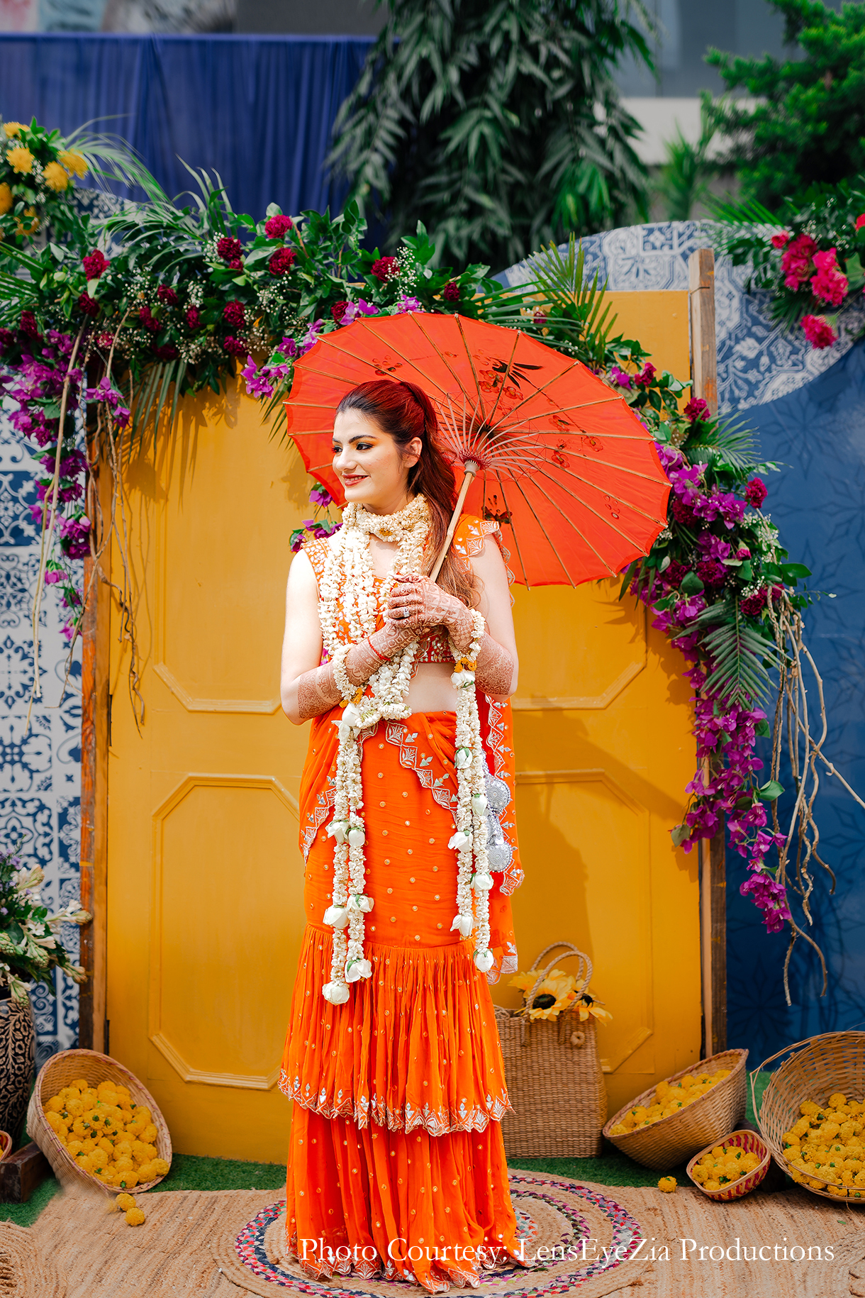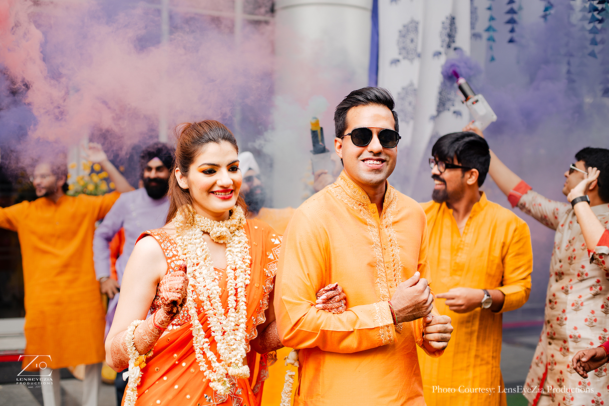 Teeming with vibrant blooms, quirky decor elements, and tons of greenery, the sunkissed haldi was a lively affair full of love and laughter. Dressed in bright orange, the bride and groom made a memorable entry amidst smoke bombs before being smeared with turmeric and showered with flower petals.