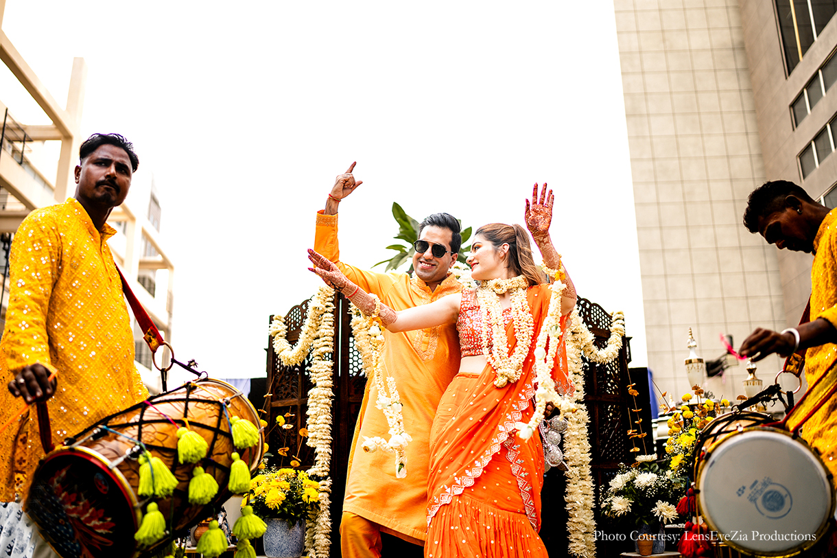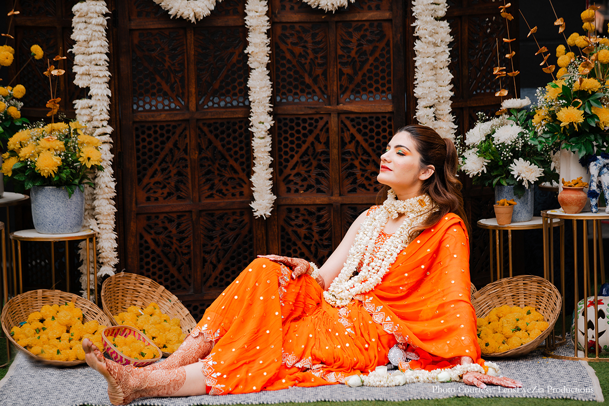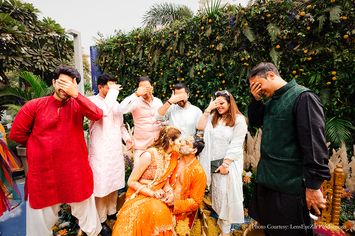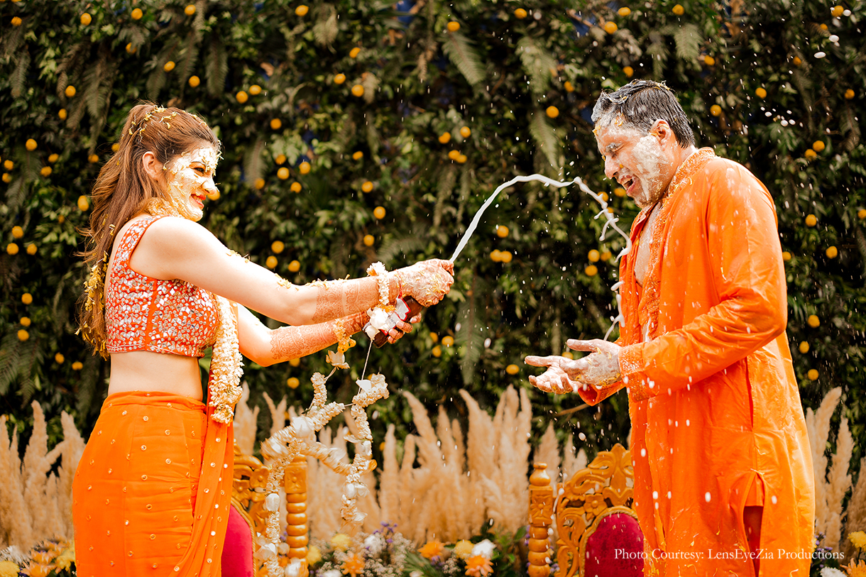 Teeming with vibrant blooms, quirky decor elements, and tons of greenery, the sunkissed haldi was a lively affair full of love and laughter. Dressed in bright orange, the bride and groom made a memorable entry amidst smoke bombs before being smeared with turmeric and showered with flower petals.