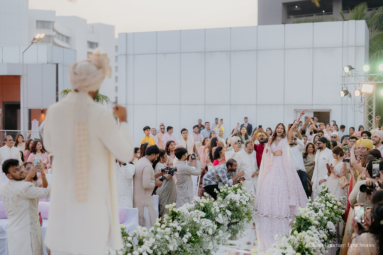 Hosted by the Powai Lake, the wedding looked serene with its pastel hues and delicate blooms. The energetic groom made full use of this opportunity to host a rocking baraat. Anushka shares, “Bhavya had always felt weird about a moving baraat. He didn’t want to stop walking if he could dance! As a result, it was a ‘concert baraat’ for him. It turned out to be an incredible experience as the baraat went on for two and a half hours with a DJ. Safe to say, Bhavya and his friends had a blast.”