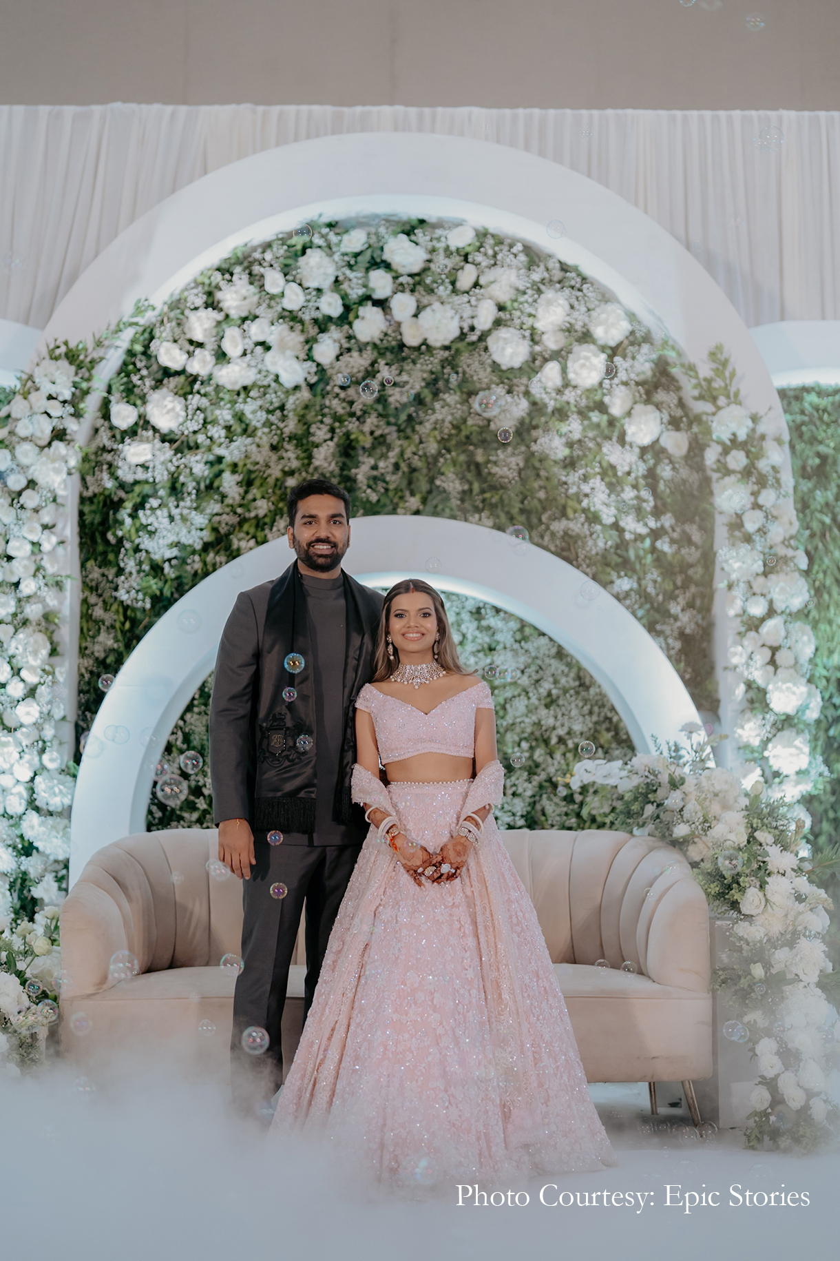 As evening fell, the couple hosted an indoor reception that followed the same color palette and design story as the wedding. With a vast stage backed by white roses and arches, the venue looked dreamy. The couple mingled with their guests freely and a live band kept the spirits high.