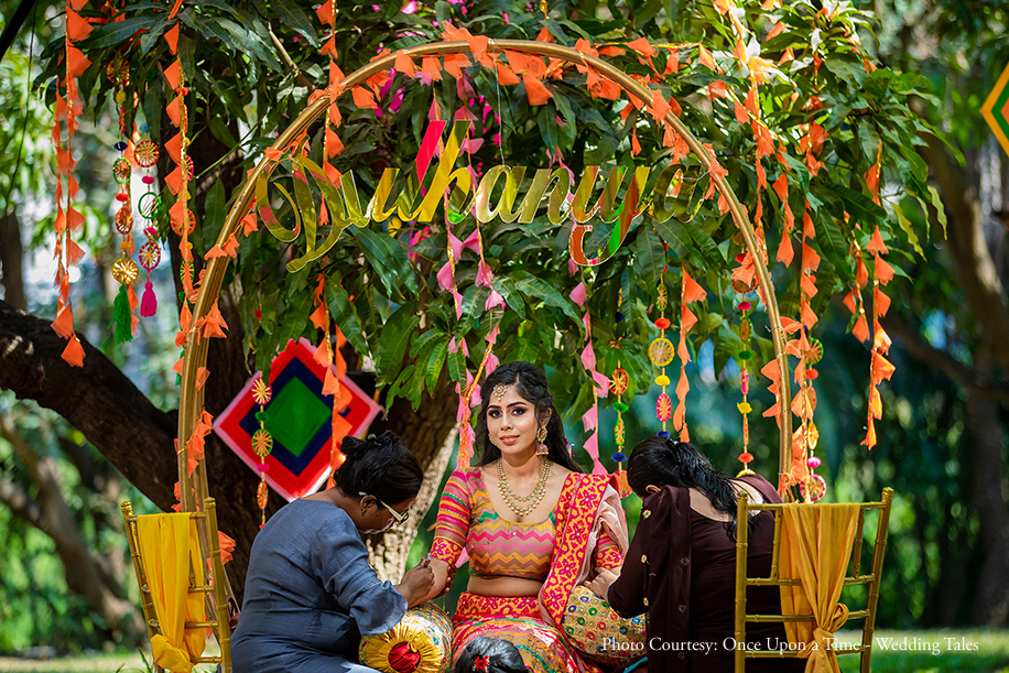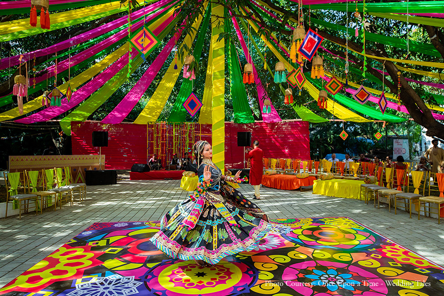 “We worked very closely with the decor team conveying our requirement for a vibrant Mehndi setup. Since we both have our roots in Rajasthan, we wanted the event to reflect the same. The open-air poolside was chosen for the function where people could sit back and relax while they got henna patterned on their hands. Traditional folk dancers, live bangle makers, and dholwalas added to the vibrant setup emitting carnival-like vibes. Colorful gazebos sheltered the guests from the bright sun.”, the couple shared.