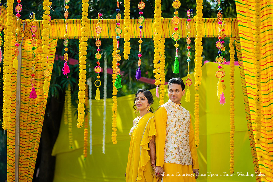 For the Haldi ceremony, Apurva wore a chic yet subtle yellow ruffle saree with a multi-colored embroidered blouse. She completed the look with a braided ponytail and temple style jhumka earrings and a maang tikka. Nikhil wore a yellow kurta and a printed off-white jacket.