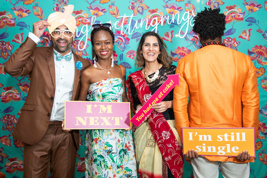 “The reception was set in a modern venue. We had hanging florals, a suspended mosaic cake and a mosaic dance floor as the standout décor pieces. We also had the most fun open-air photo station; a bohemian floral backdrop with quirky Indian photo props!”