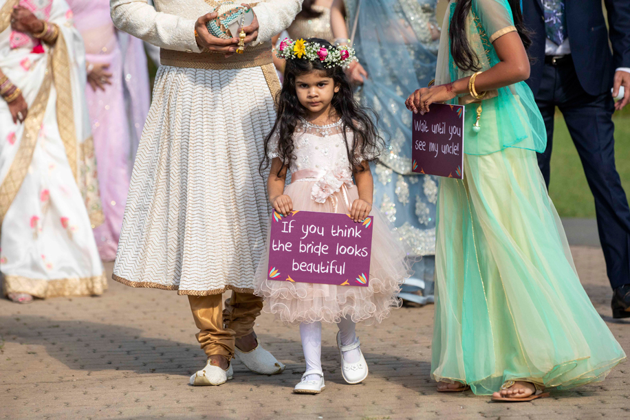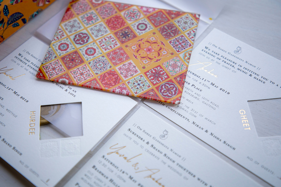 We designed our own wedding stationery, props and backdrops. Designing our wedding invitation was the most fun-filled experience. The vibrant colours of mustard, pink and blue, and the artwork from the wedding invitation was extended into the design of all the other stationery, as well as decor props and inspirations. Together with our designers in India, we also created bespoke wedding outfits, inspired by our theme.”