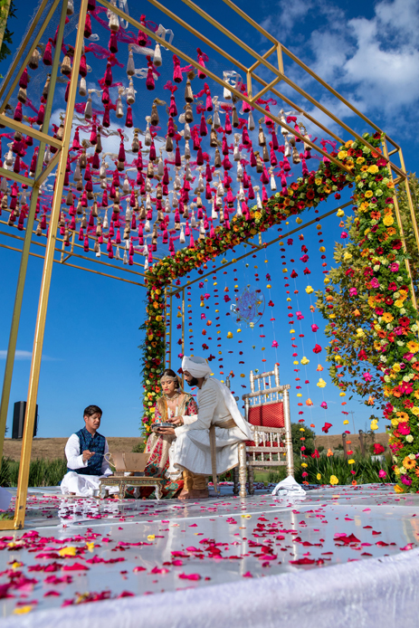 While Arahna’s unique lehenga imbibed the patterns and colors of their vibrant invitations and décor, Yuval’s ensemble was reminiscent of Rajput kings, combining the elegance of flared anarkalis, turban and necklaces with quirky tribal embellishments. The ceremony was followed by a laidback picnic on divans under gazebos that were decked up with fun props like old posters, Indian trucks, bicycles and more.