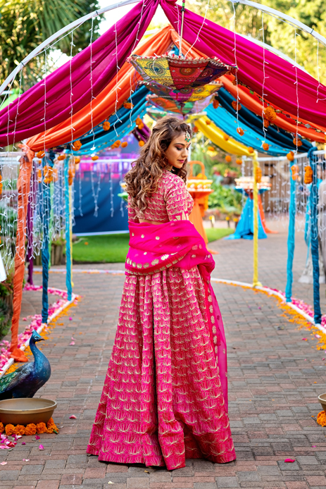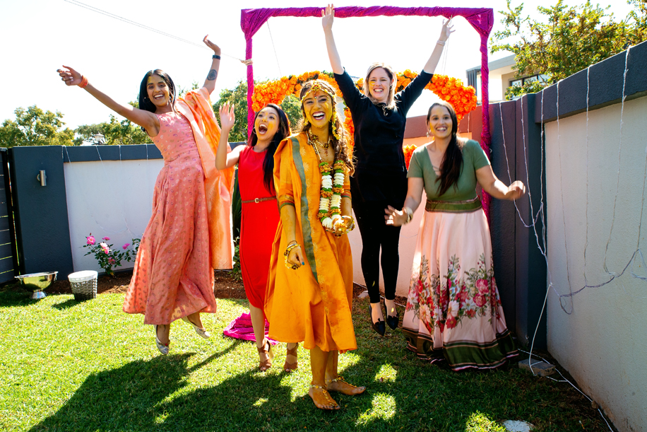 As per tradition, the “Hurdhee” or Haldi ceremony was held separately for the bride and groom. Arahna wore a midi lehenga custom made from a silk saree she bought. She had a ball with her friends and family at the sunny, marigold festooned festivities.