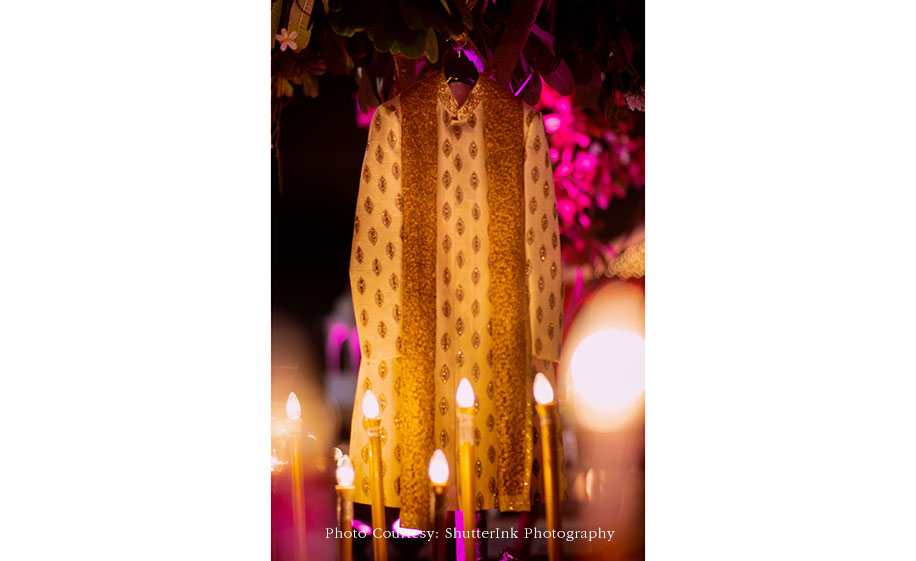 Shitij’s sherwani with lustrous embellishments awaits him for the wedding ceremony.